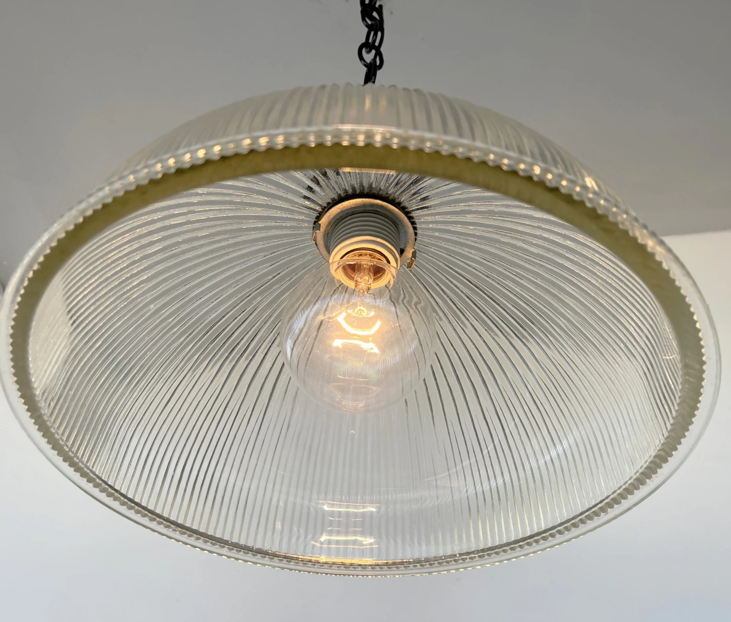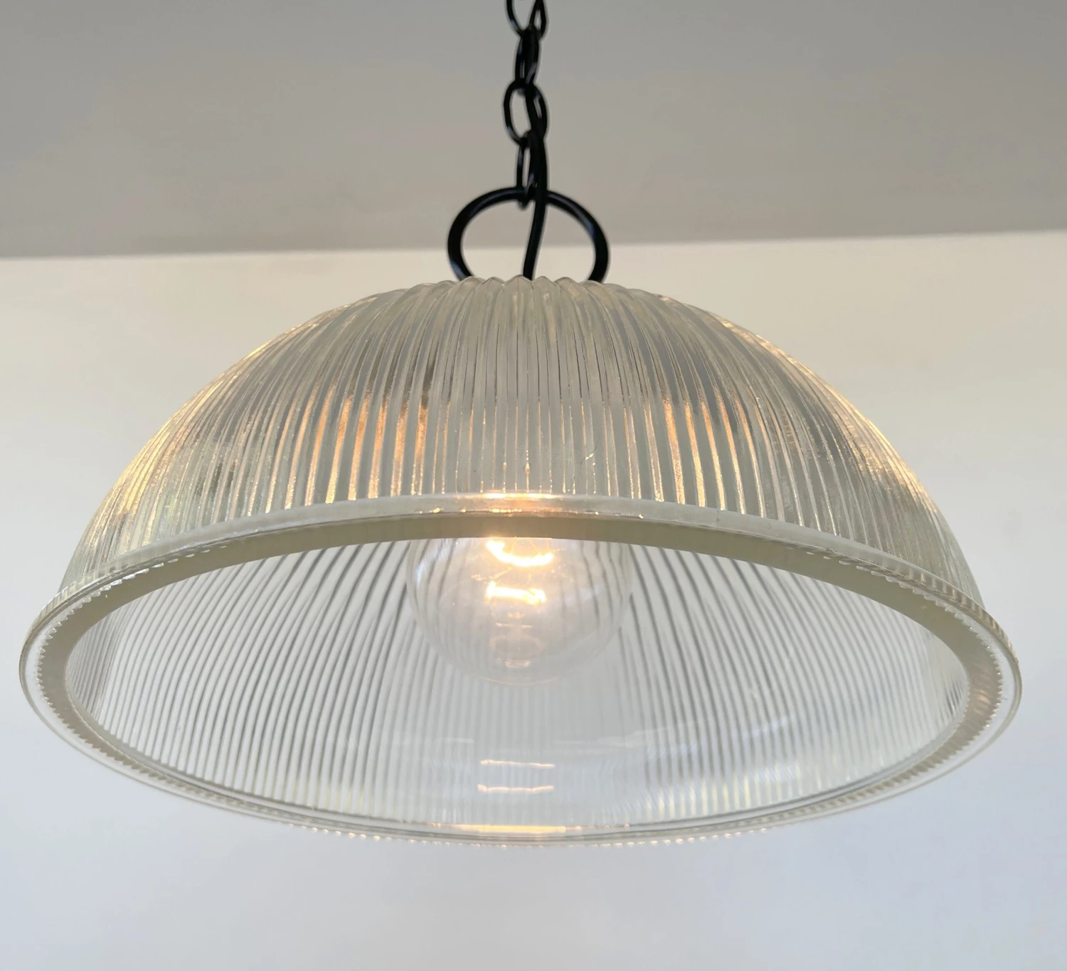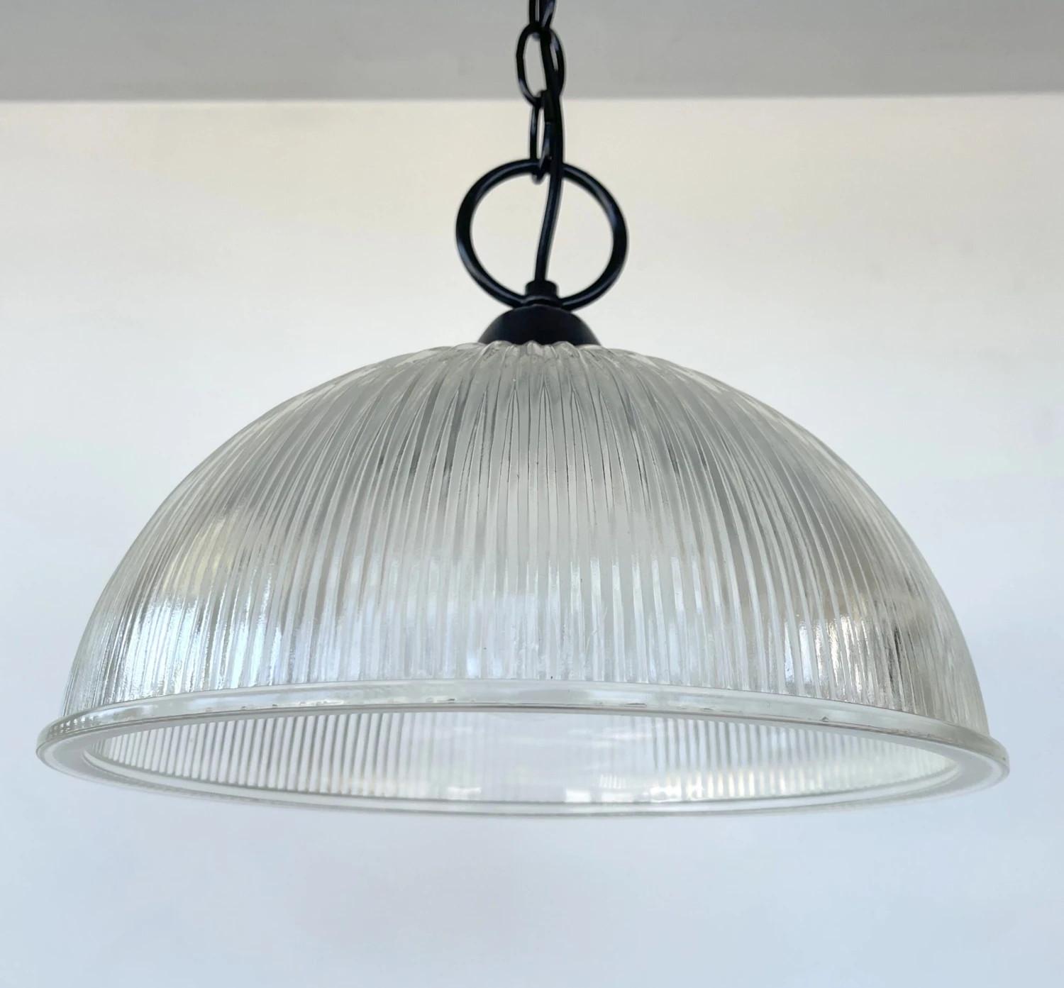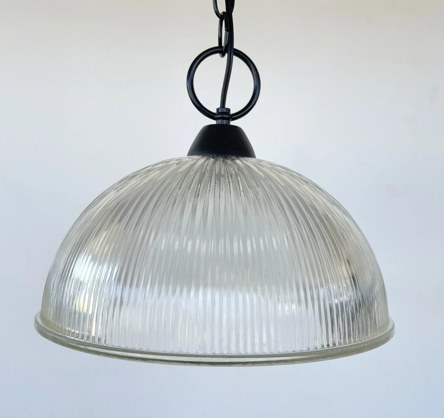 Holophane glass was designed to scatter the light for factory work. And this chandelier pendant light fixture does just that. From the 1960’s it’s a heavy holophane glass created into a modern chandelier light fixture ready for installing over your kitchen table, island or bathroom sink.