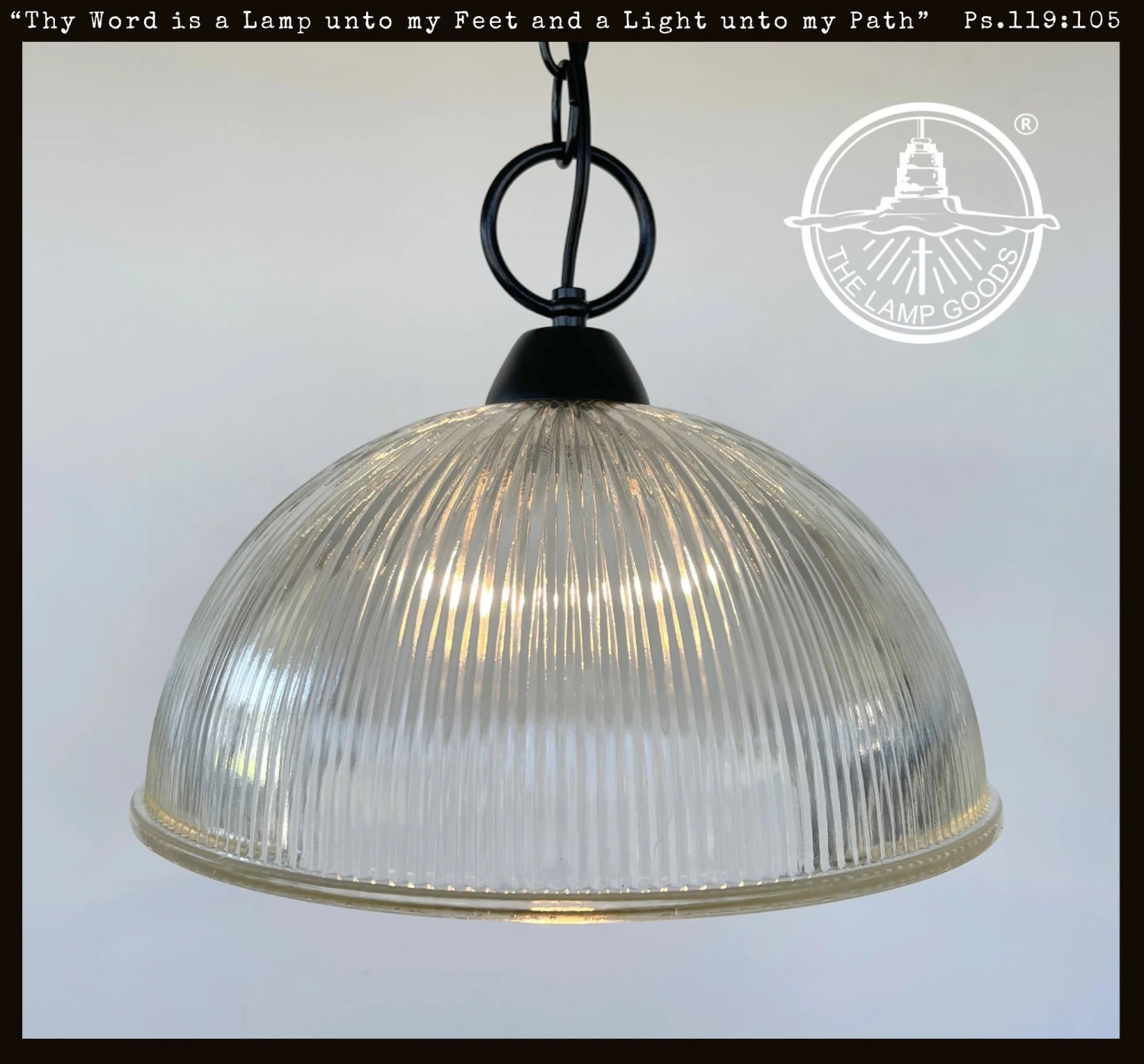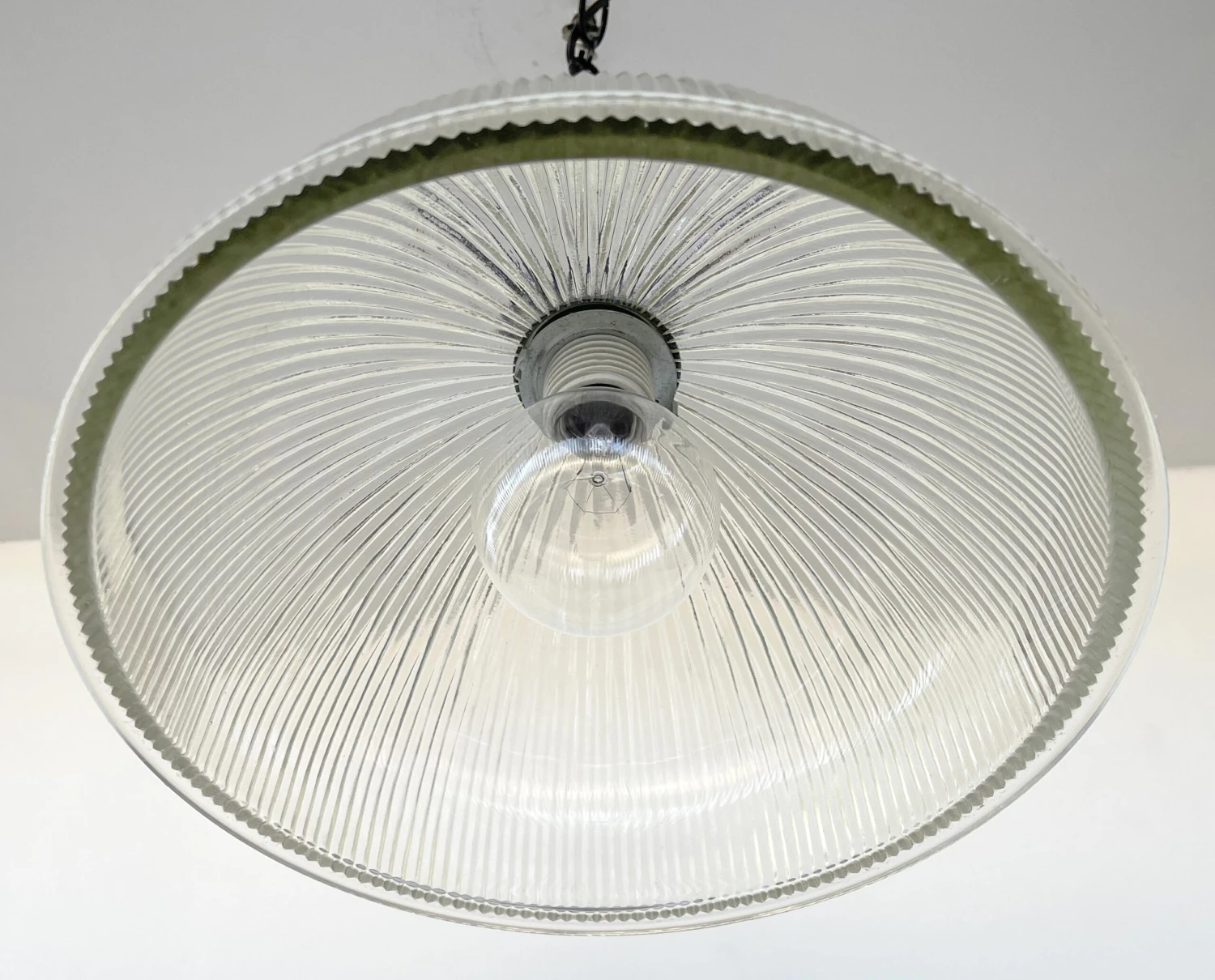 - 10″ high and 12″ wide Factory Antique Heavy Holophane 1960’s Glass Shade Pendant