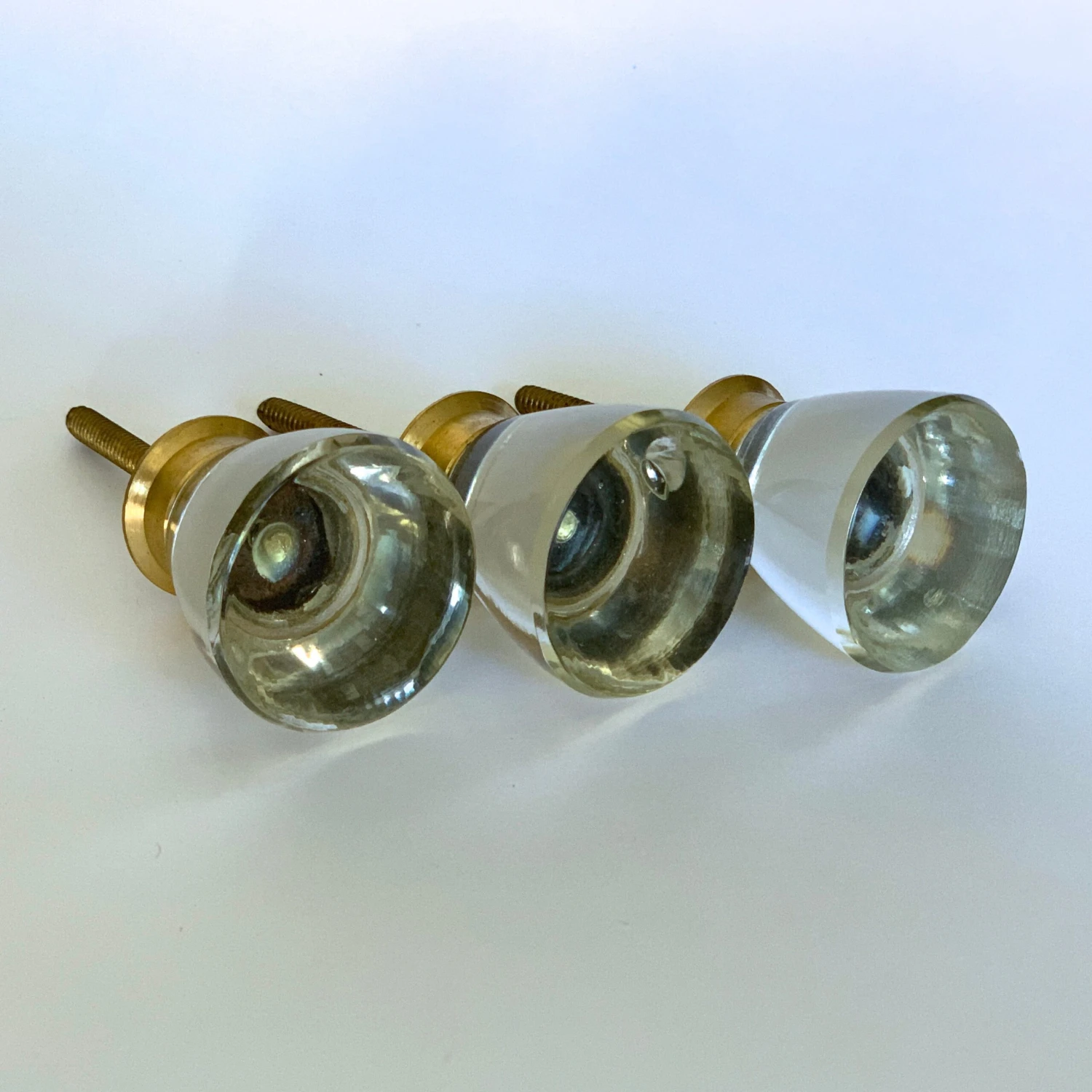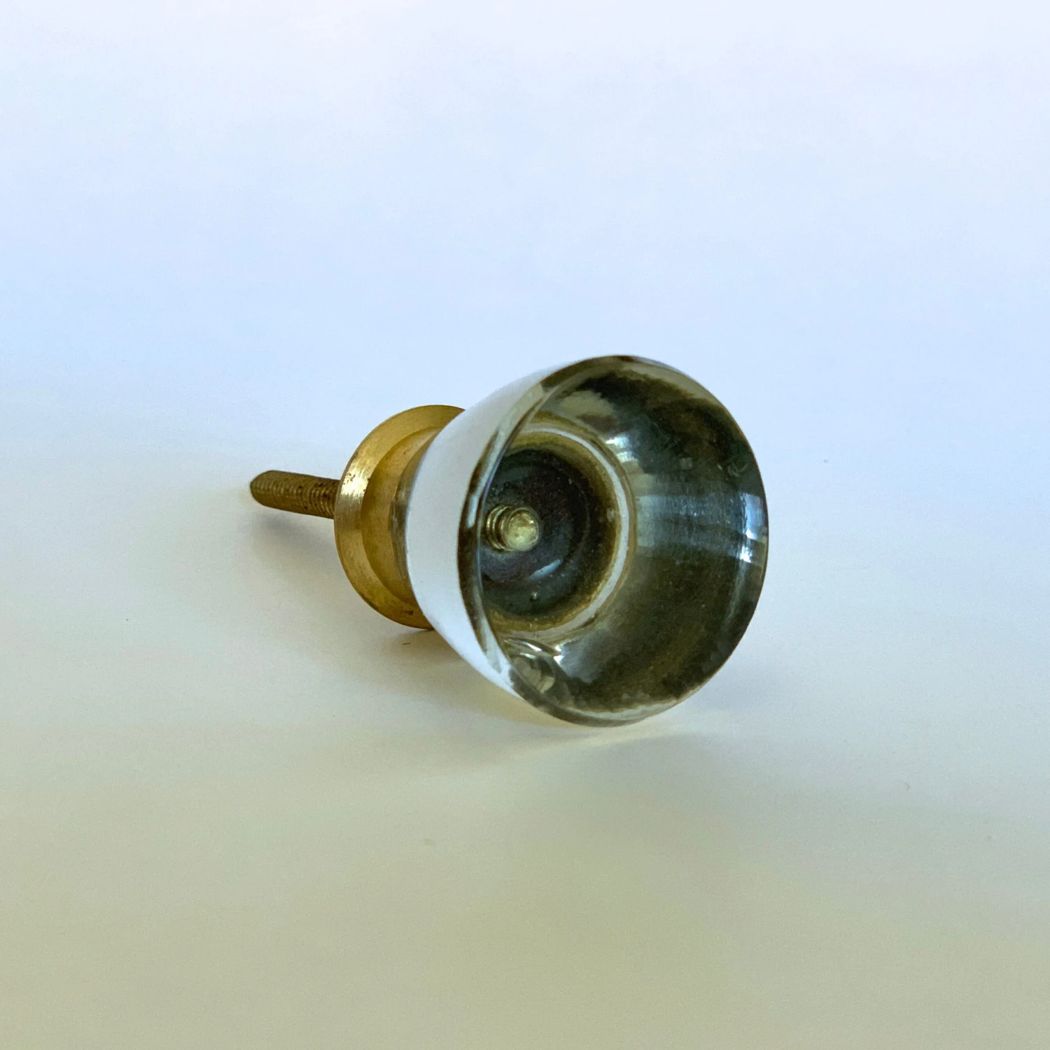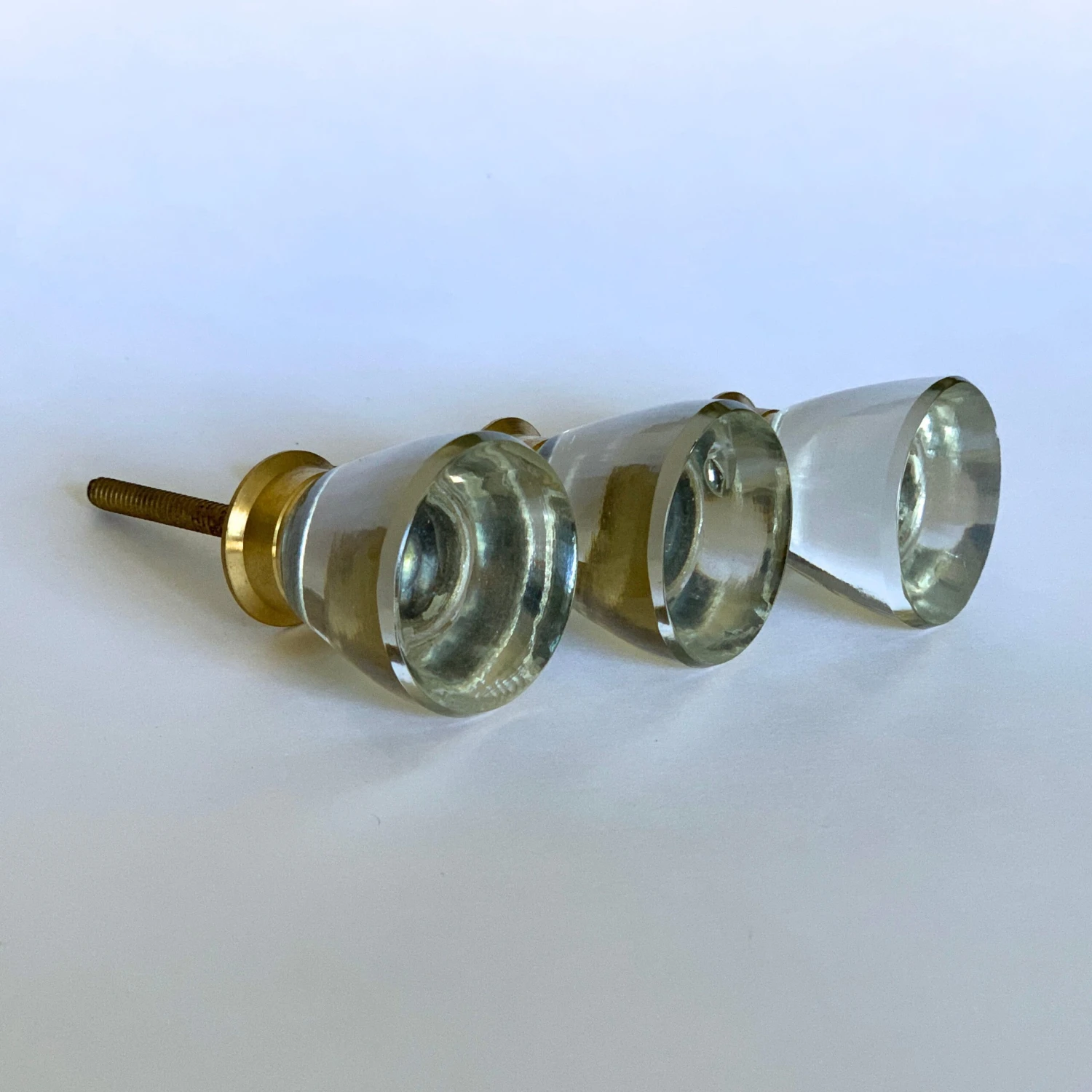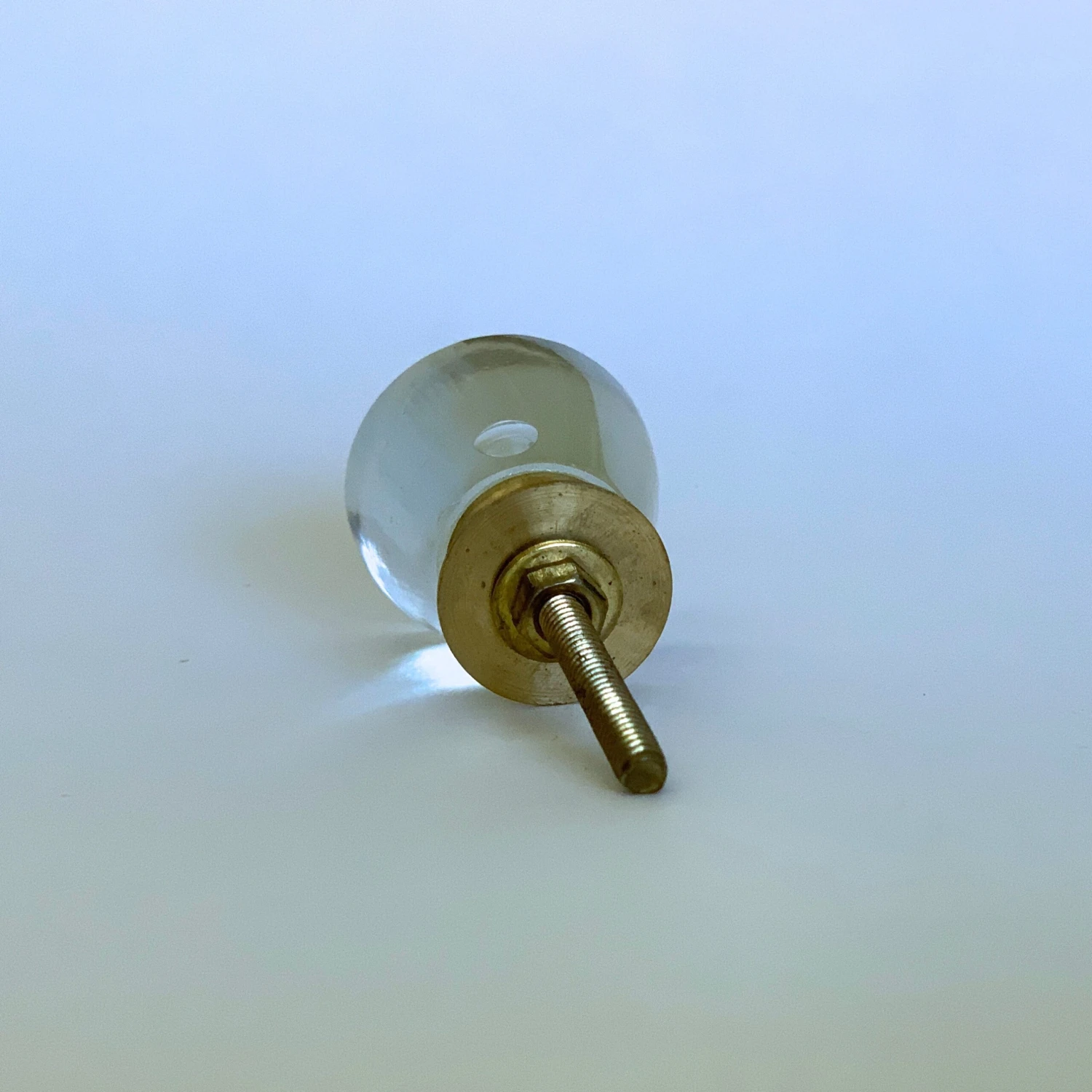 Clear Beach Glass Knob. Simple round design. Solid glass center with gold metal fittings. A beautiful bathroom pull or kitchen cabinet pull. The perfect size and color. Simple and beautiful, this is a lovely knob with just the right amount of fabulous.Â
