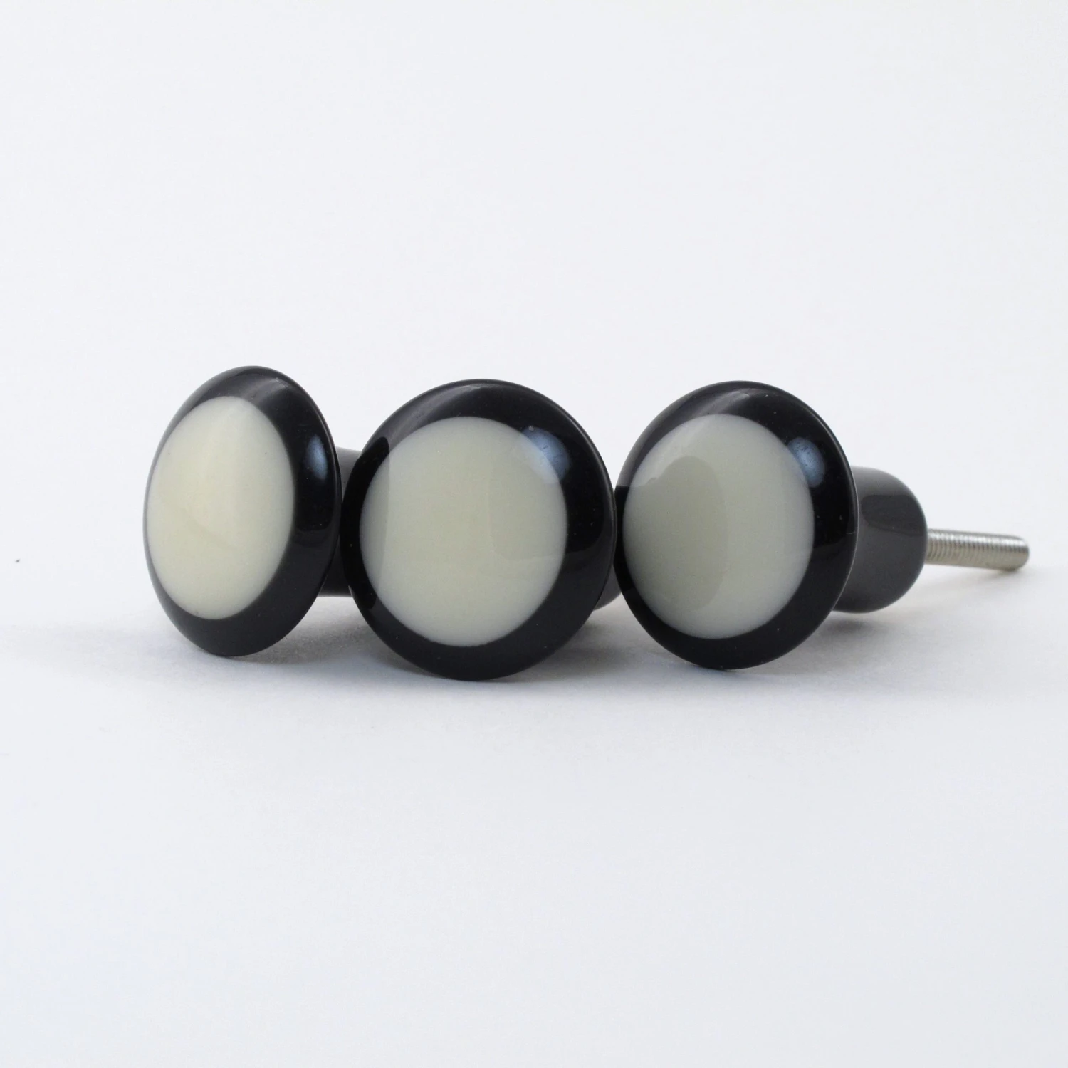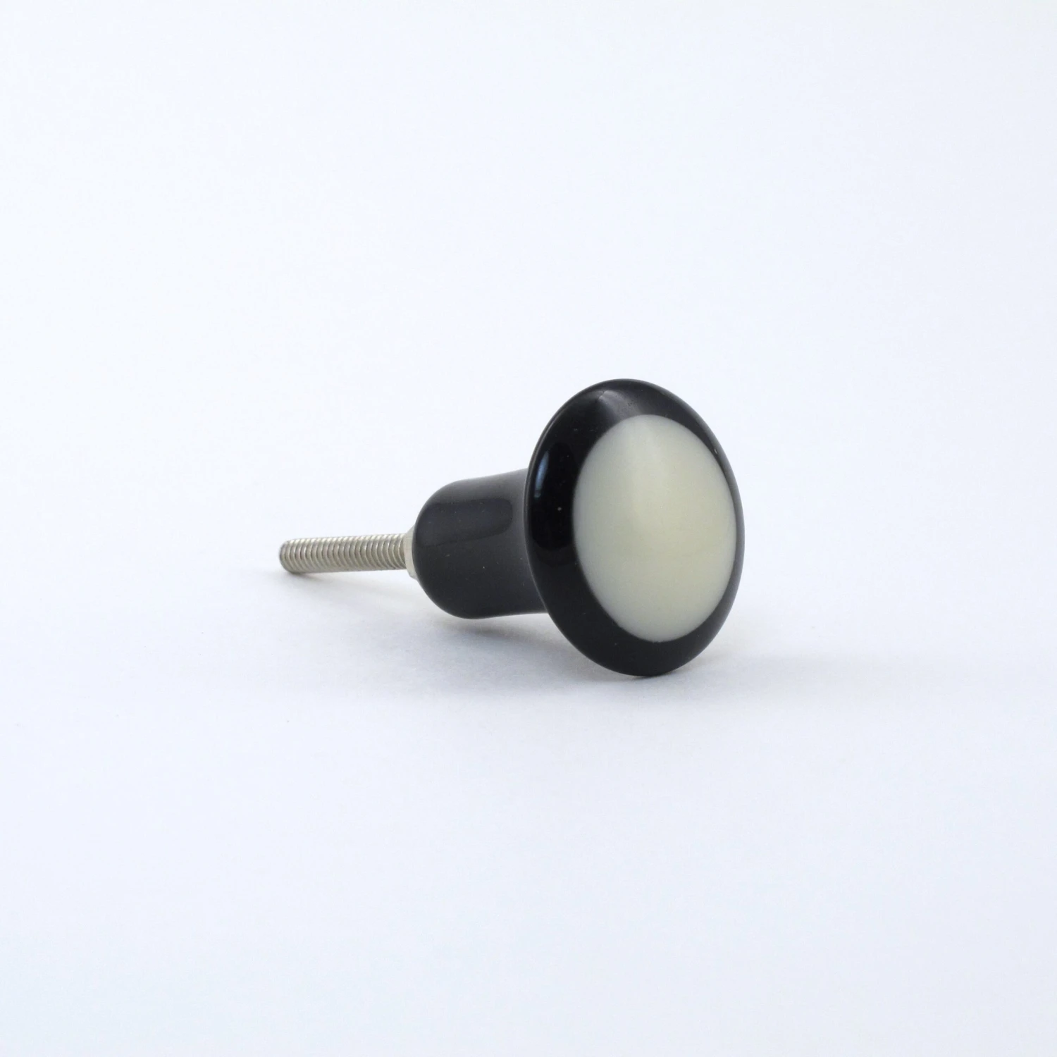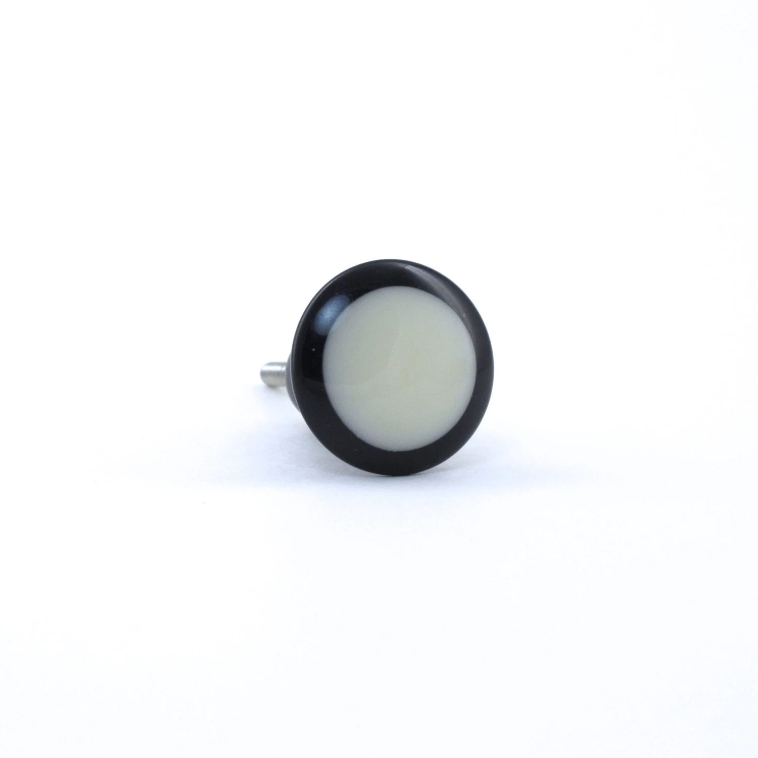 Black and White Dottie Knob. Made of black and white resin, with silver metal finishings. This handmade knob is one of our smaller knobs, perfect for dresser drawers, desks and end tables. It’s a simple modern design with a round white resin center. Beautifully crafted, this knob has a soft feel and would be the perfect accent piece to your remodel!