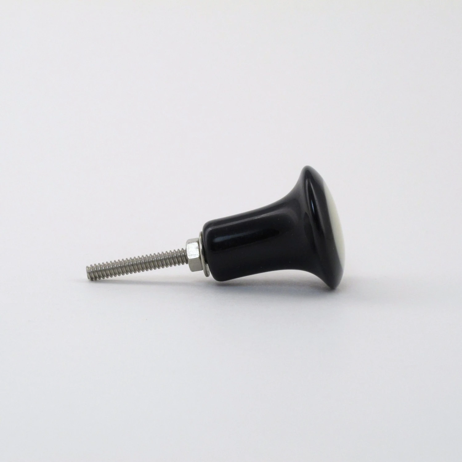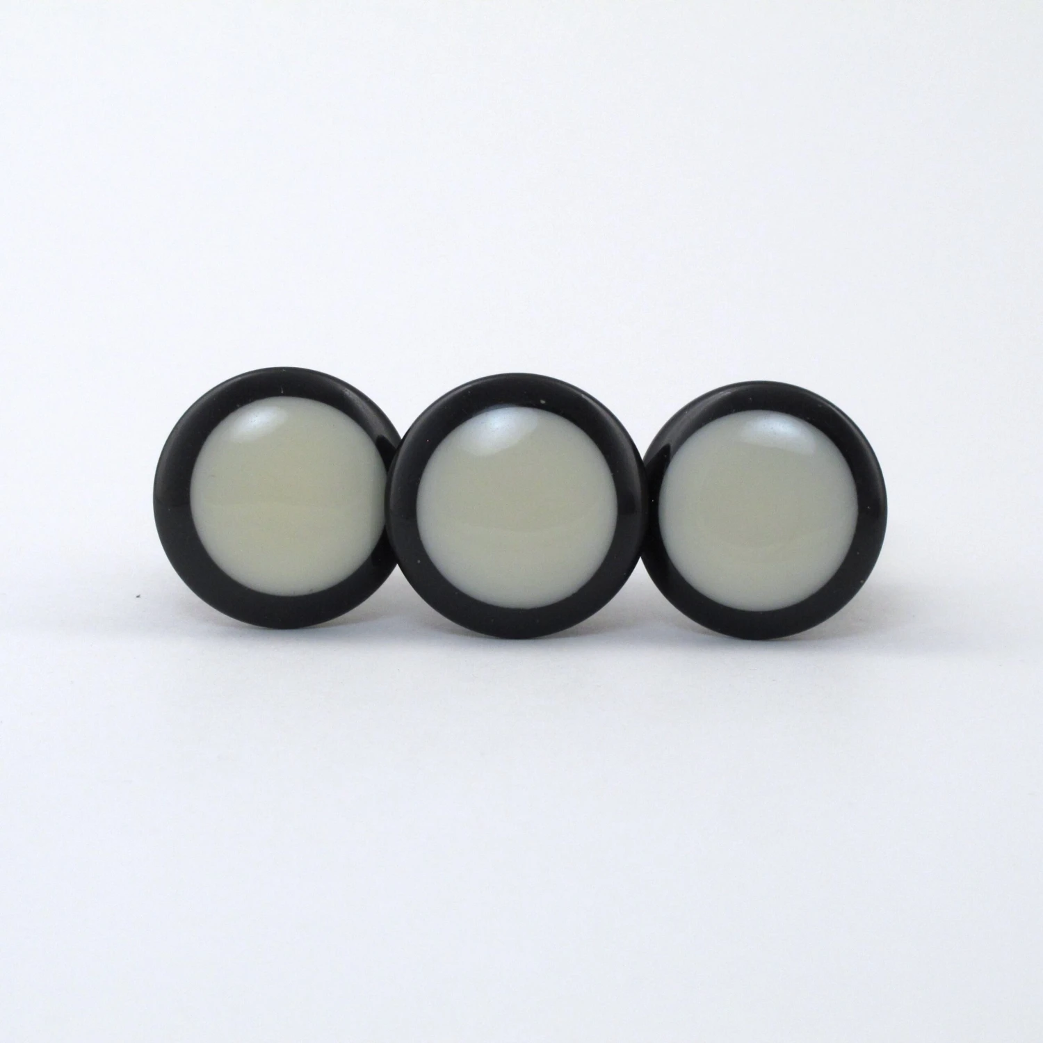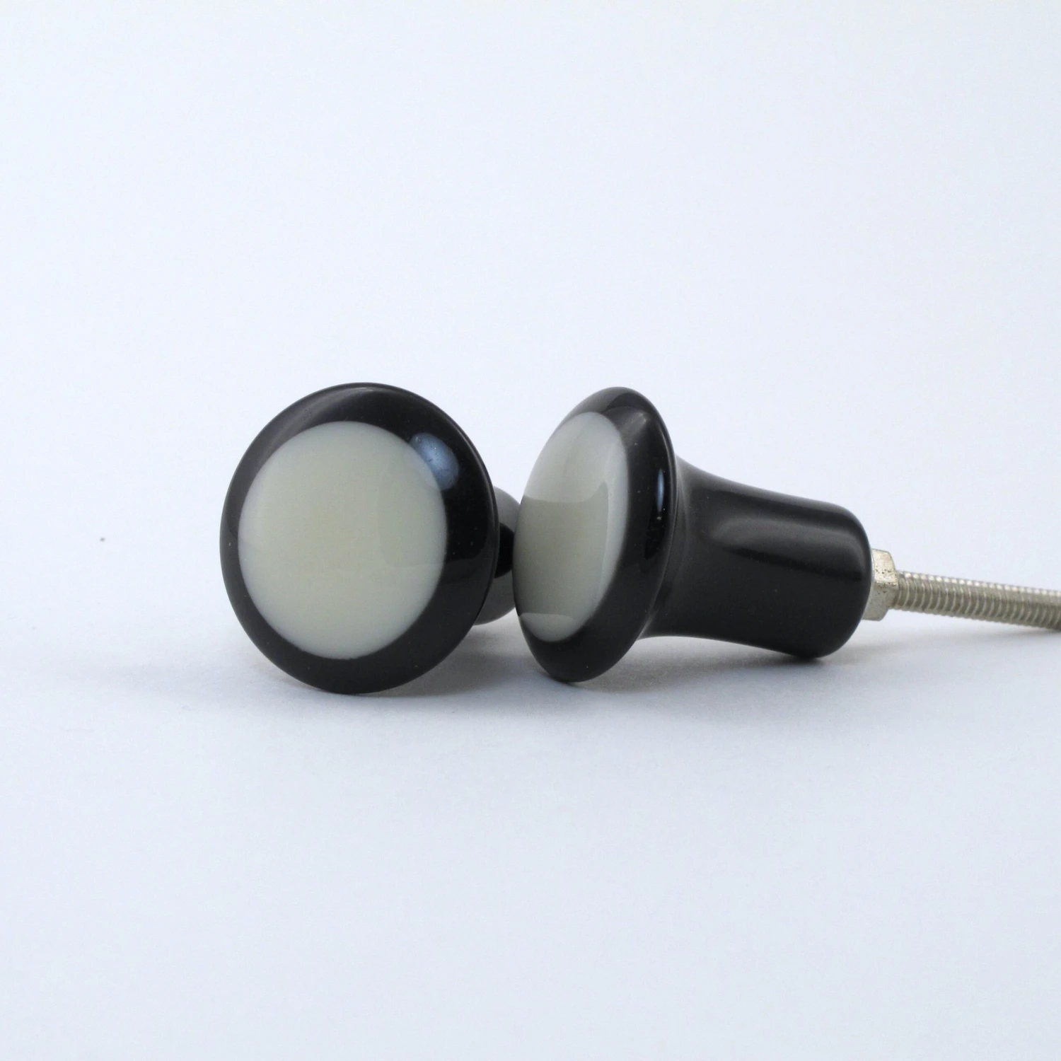Black and White Dottie Knob. Made of black and white resin, with silver metal finishings. This handmade knob is one of our smaller knobs, perfect for dresser drawers, desks and end tables. It’s a simple modern design with a round white resin center. Beautifully crafted, this knob has a soft feel and would be the perfect accent piece to your remodel!