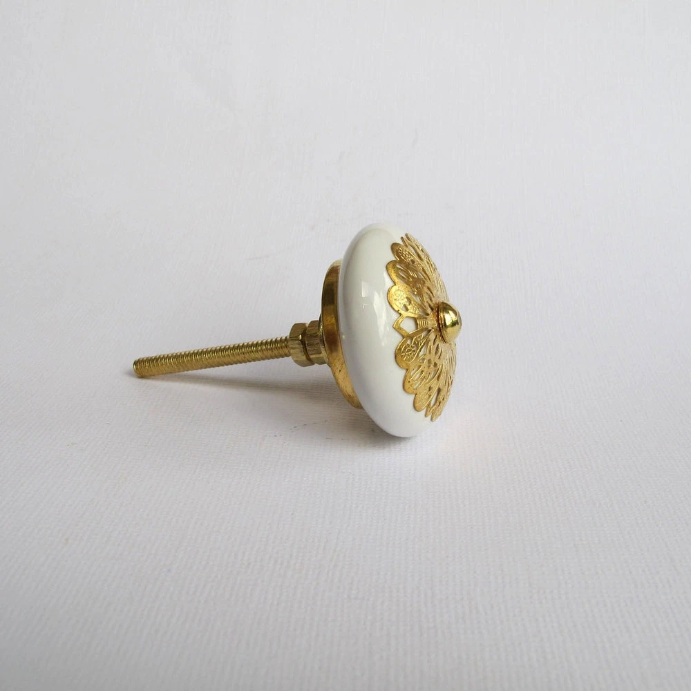 Intricate gold lace filigree design resembling butterfly wings on white ceramic round knob. Vintage style knob, classic design. Beautifully detailed, one you are sure to love! White ceramic knob with gold metal design overlay. Â