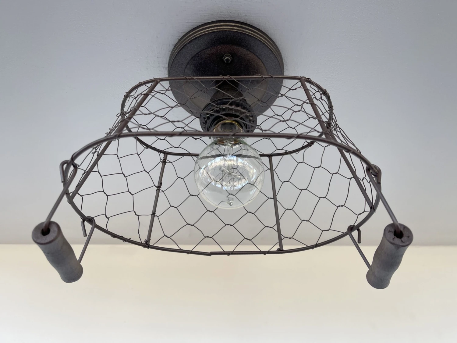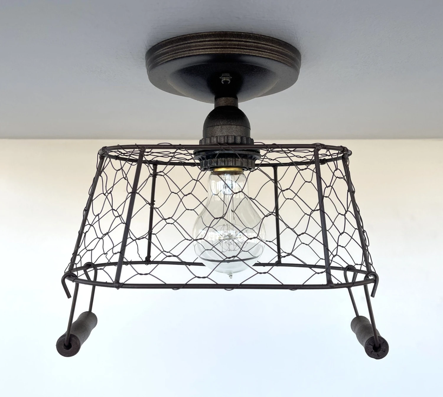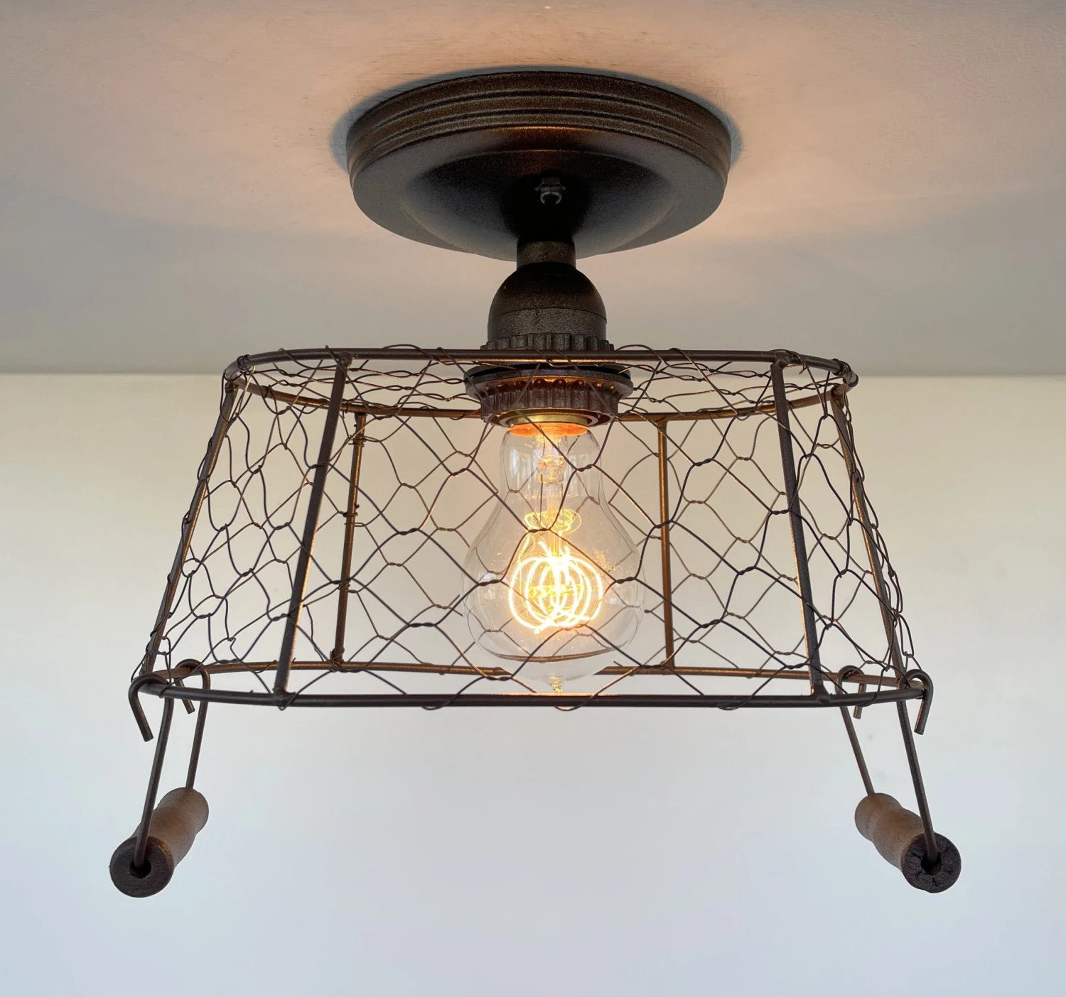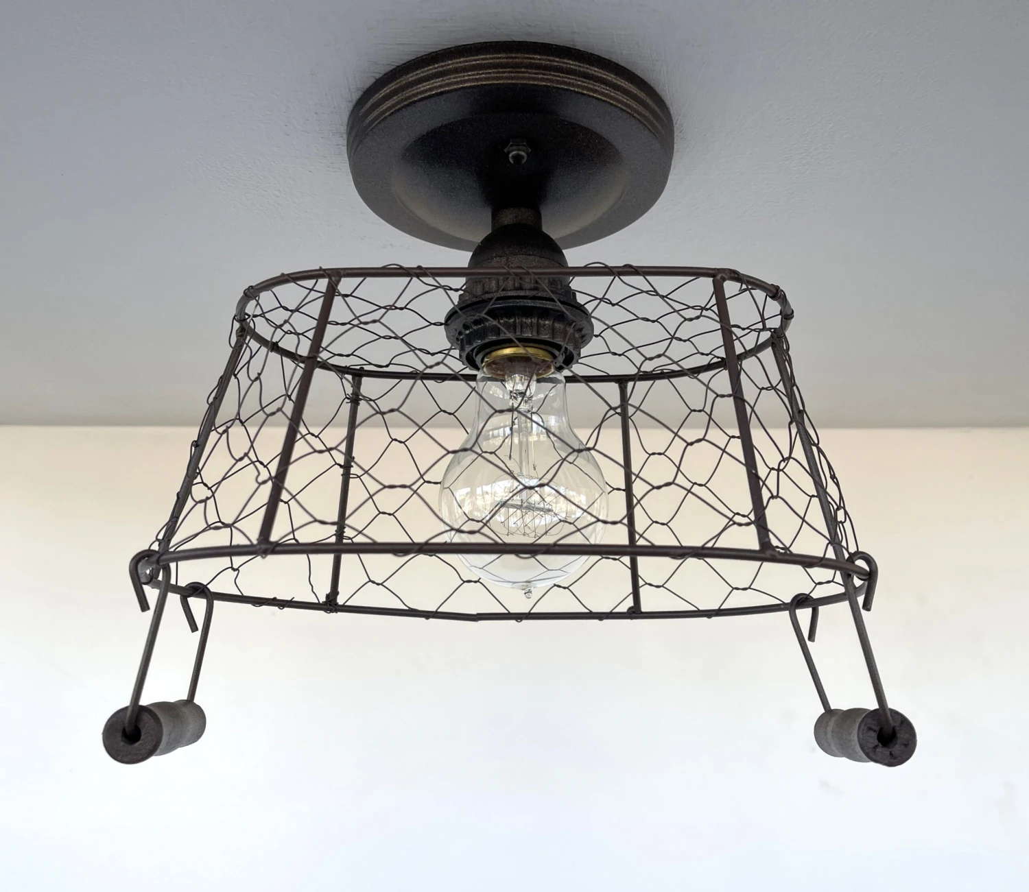 - 10.5″ wide x 9″ Tall x 6.5″ deep Rectangular Chicken Wire Ceiling LightÂ