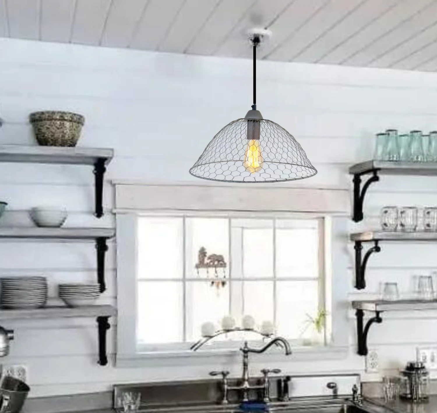 Farmhouse, country or cottage decor, this original ‘chicken wire’ pendant light will charm your friends. As a hanging light fixture in a rustic finish, it will add a casual touch to kitchen island, laundry room or favorite reading spot. Large in size gives this farmhouse pendant light plenty of impart for the space.