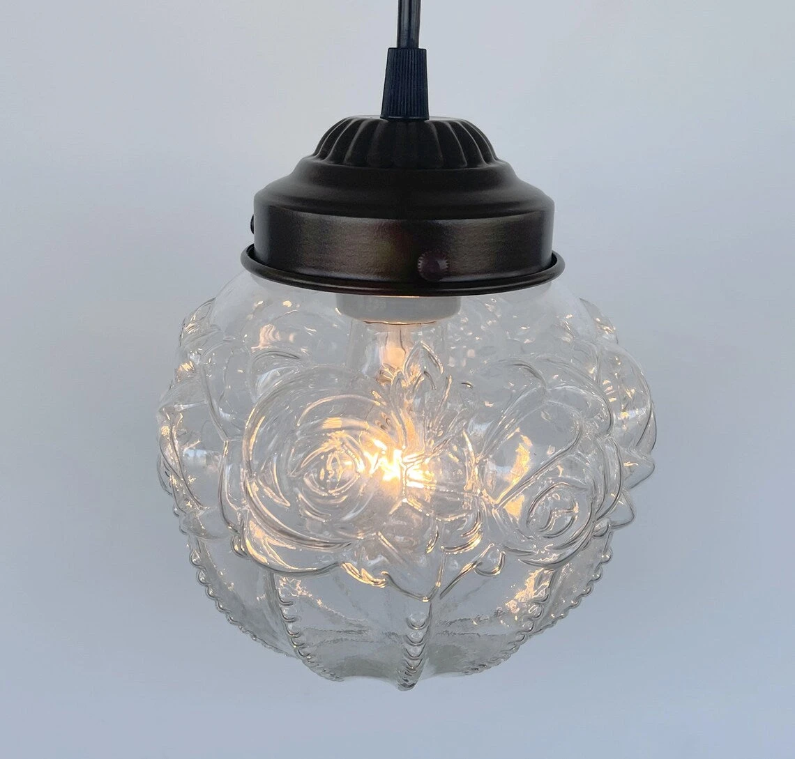 Radiating with charm, this pendant is a tradition beauty. Using antique embossed glass pendant lighting with a floral pattern makes the perfect choice for over your kitchen island or bathroom vanity light fixtures.Â