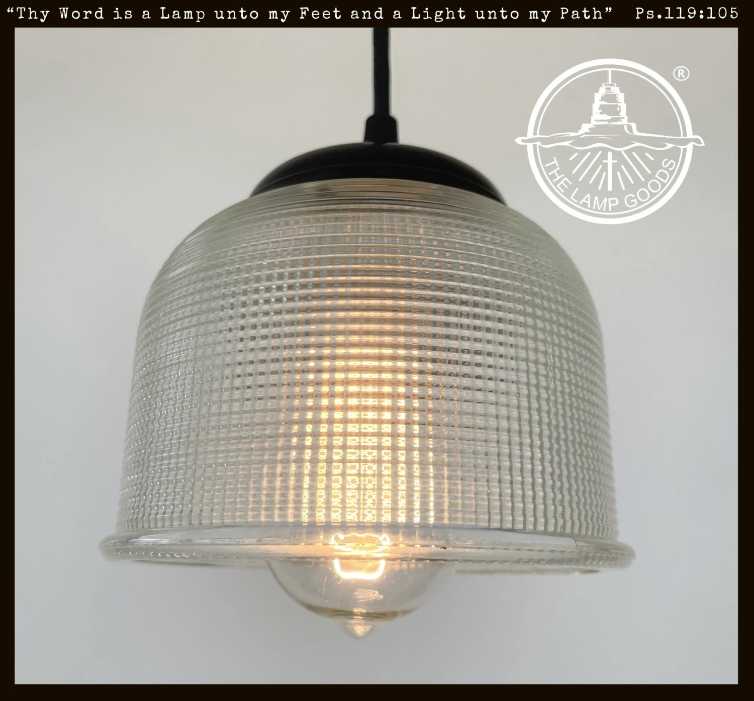 Holophane glass was designed to scatter the light for factory work. And it does just that. This vintage & heavy holophane glass has been created into a modern hanging pendant light.