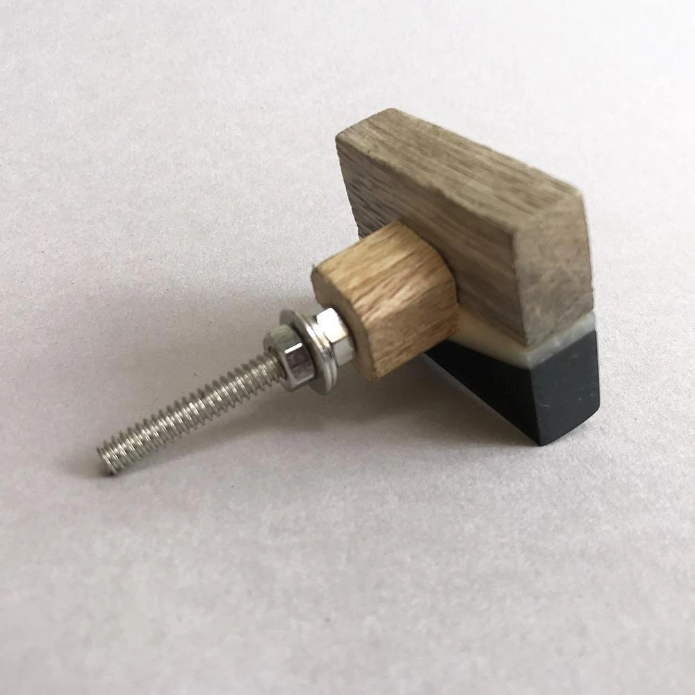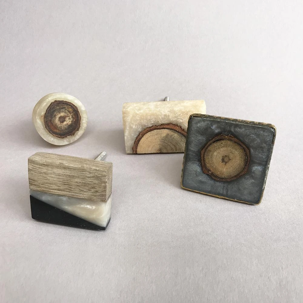 Frosted Timber Knob. Modern geometric design made with wood, resin, and metal. Each drawer pull is a little different and completely unique. Handmade, high-quality home hardware you’re sure to love!  Pictured with our Geia Collection of knobs.