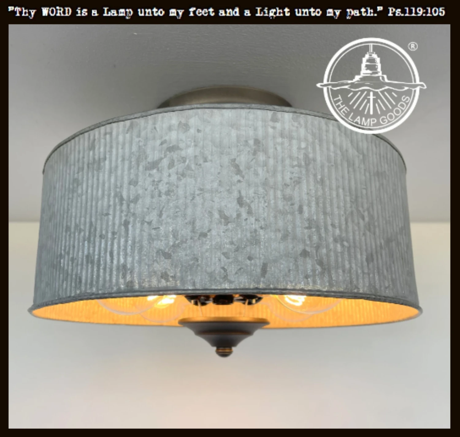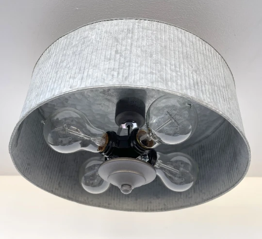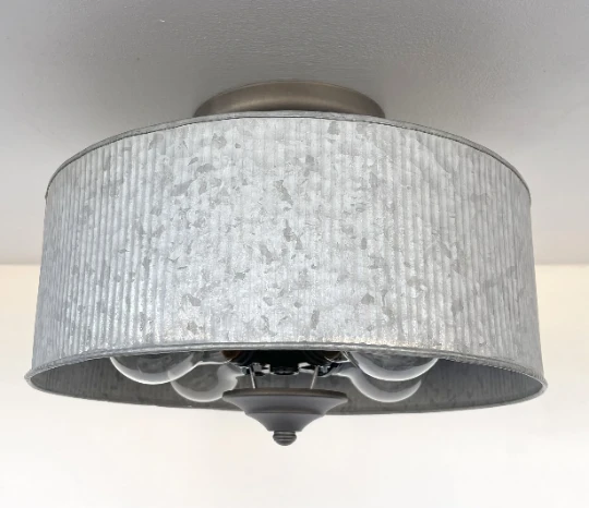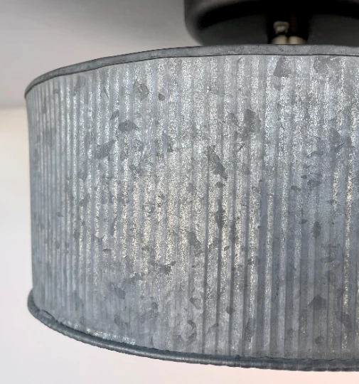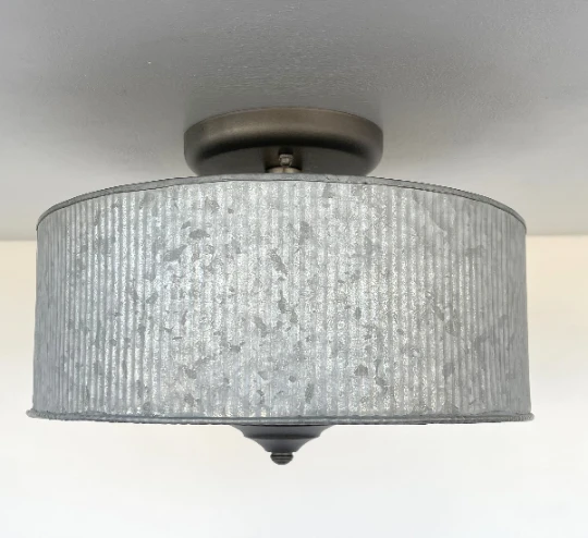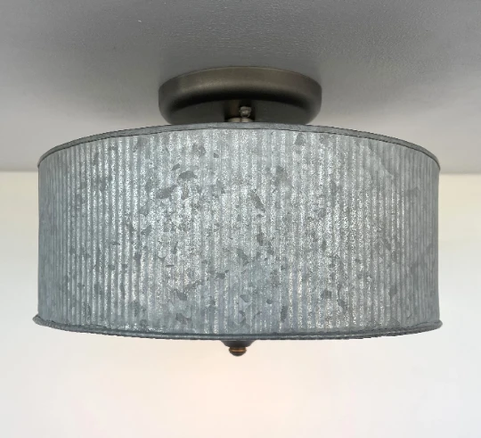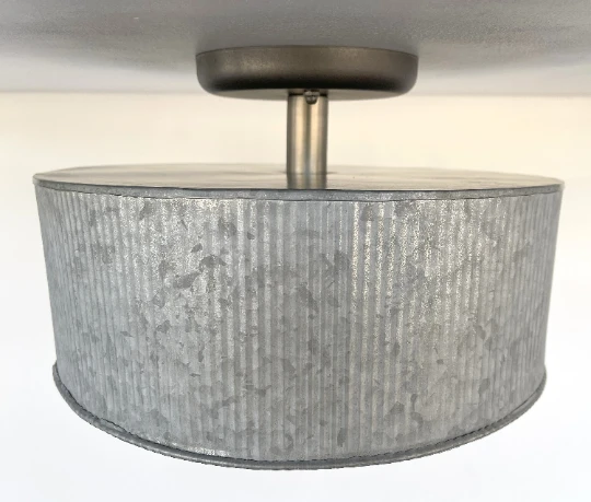- 8.5″ tall and 12” wide Galvanized Metal Drum Shade Ceiling Light