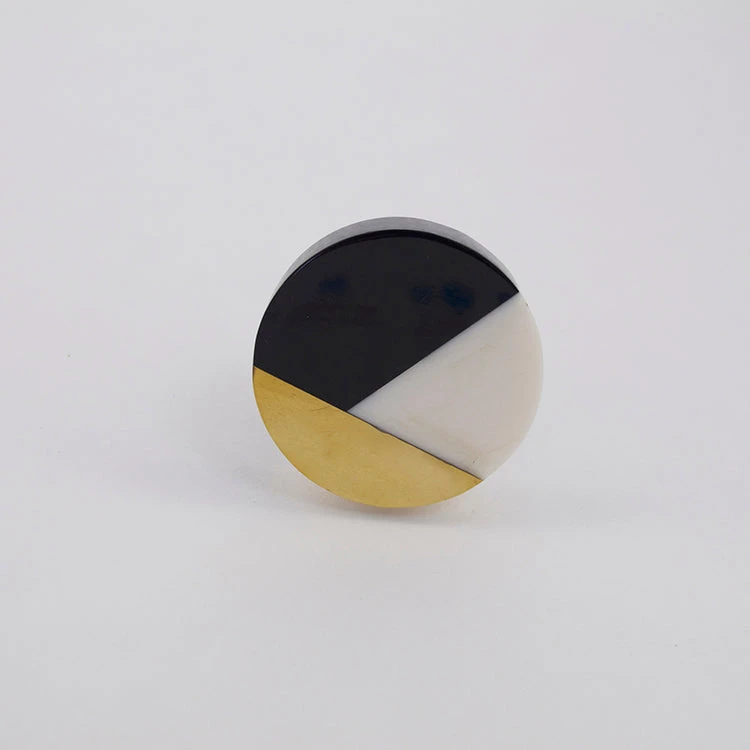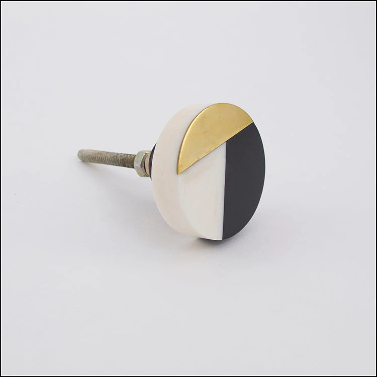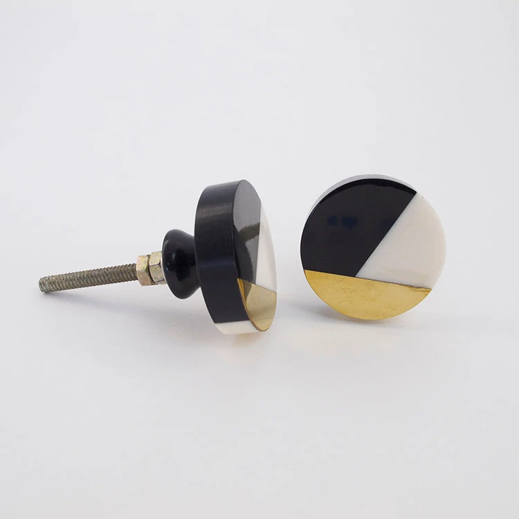 Modern Black and Gold Geo Knob. This beautifully designed geo knob is made with black and white resin. It is accented with a metal gold corner. Modern angles and bold color blocks create the perfect drawer pull for a chic and modern remodel. This knob would be perfect for cabinets, dressers or a nightstand.  Handmade.Â