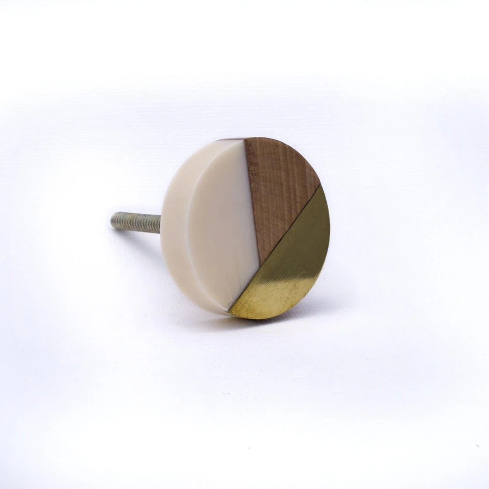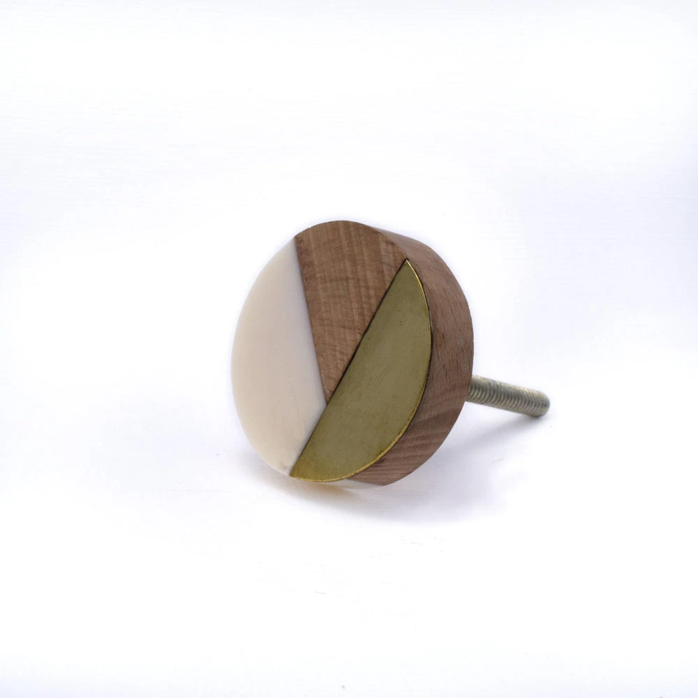 Top Selling – Modern Geo Knob. Round wooden cabinet knob made with white resin, wood and gold accented geometric shapes. The perfect modern cabinet knob for your kitchen remodel. Â
