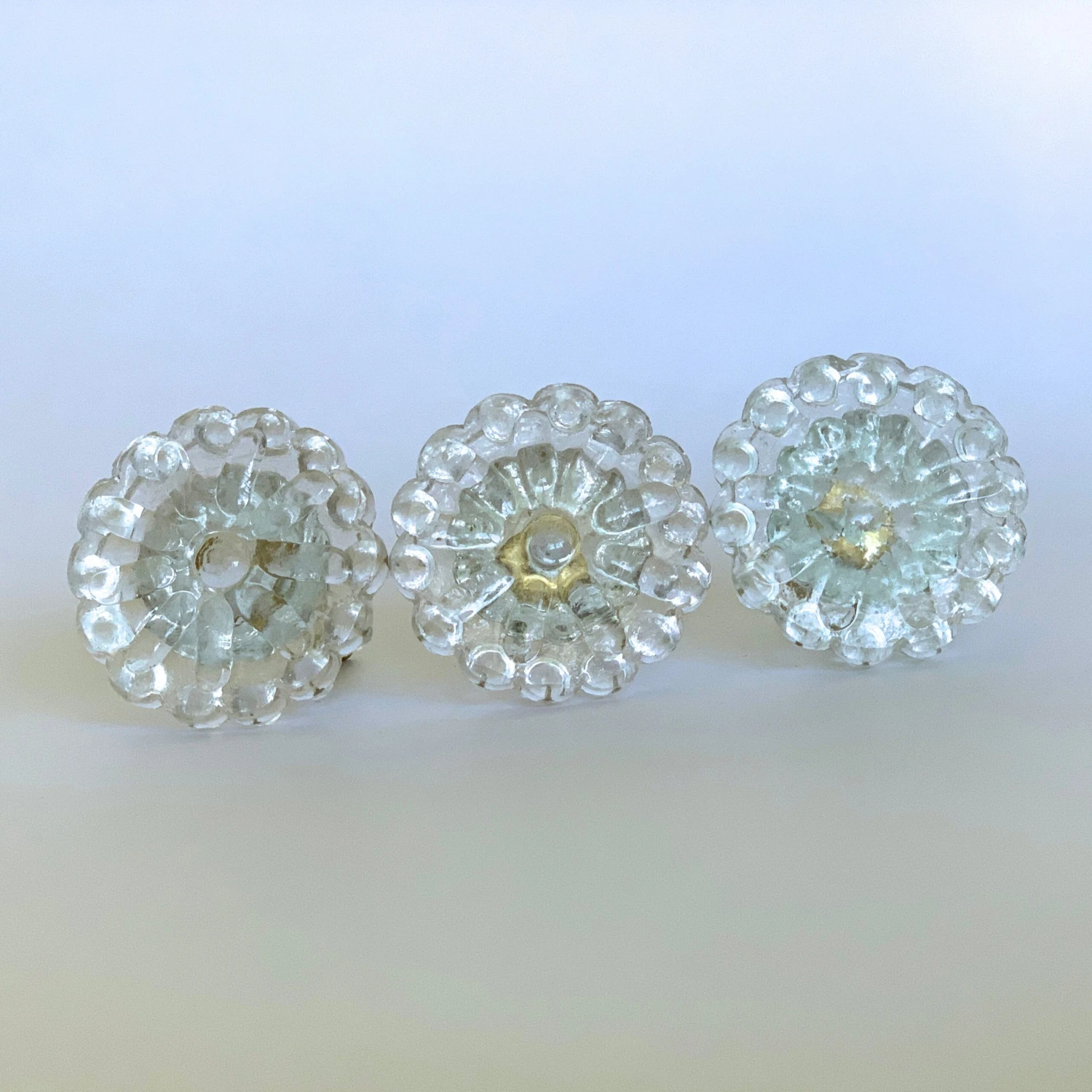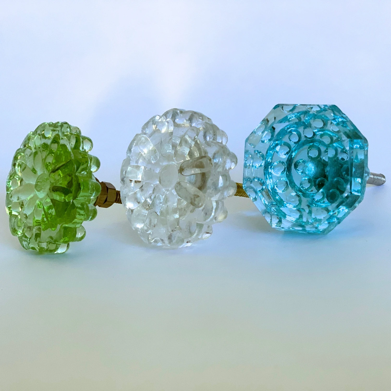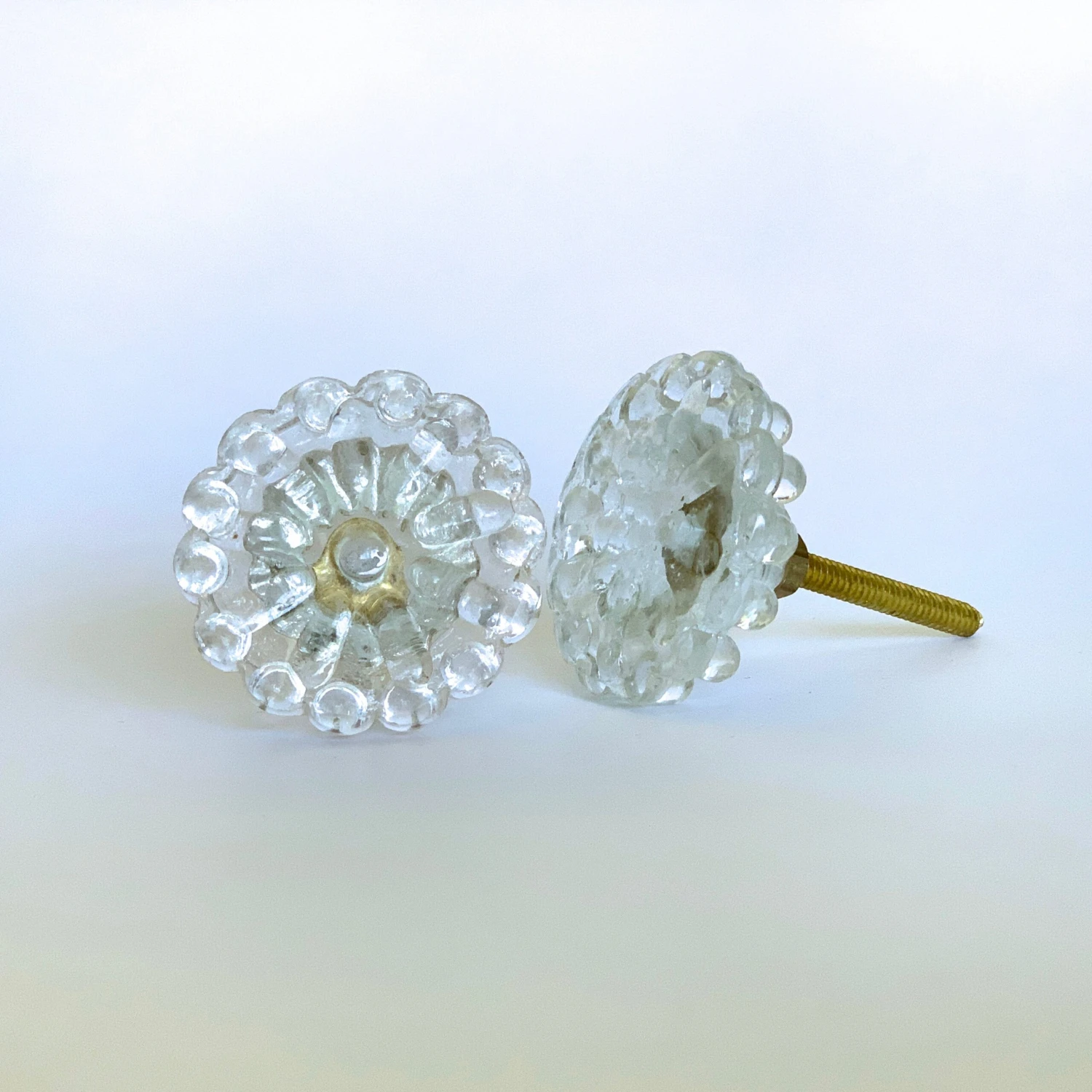 Beautiful Glass Moon Drop Knobs. Each uniquely special and different. Vintage, dainty, and beautiful, these lovely knobs are all kinds of amazing. From the tiny glass beveled edges to the delicate perfectly placed petal-like shapes. This knob is one you’re sure to fall in love with over and over again. It is the perfect finishing touch for that dresser you’ve been wanting to make over. Â