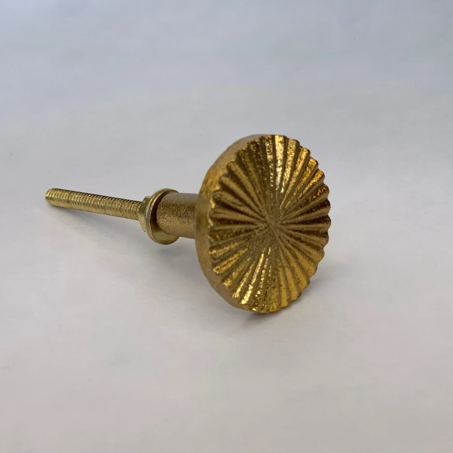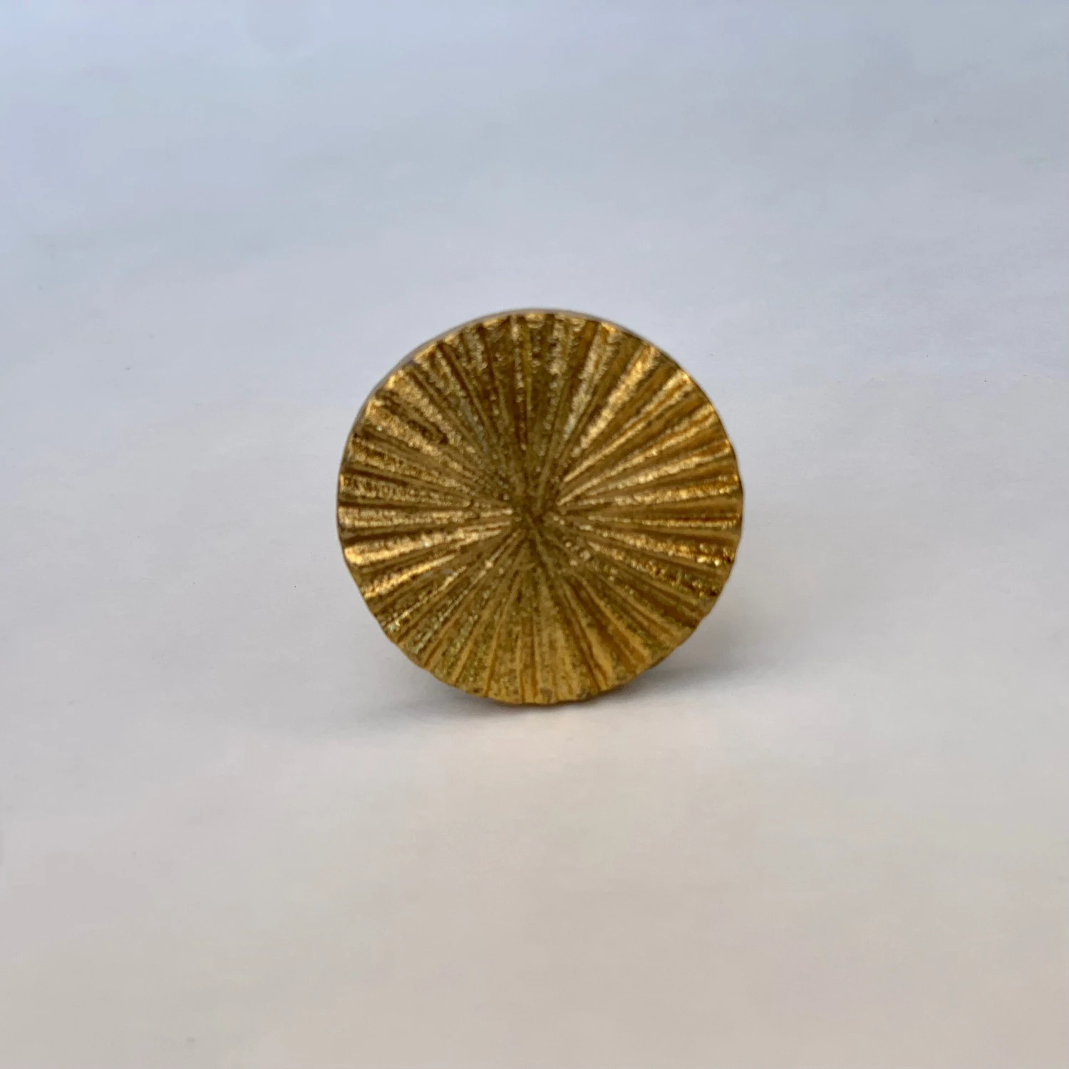 The Gold Radial Knob. A beautiful gold round metal knob with a wavy, radial design that feels both modern and elegant. This would be a perfect knob for a dresser or side table. It adds a touch of sophistication in a stylish, fun way! Made of gold metal, this knob is very sturdy and has a high-quality finish and feel. Knobs are sold individually. Also available in Silver.