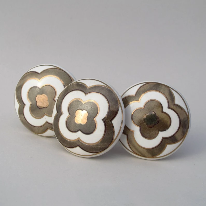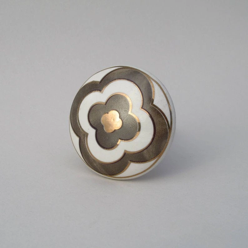 Grey + Gold Floral Clover Knob. This unique knob is a lovely accent to any kitchen cabinet, bedroom dresser, or bathroom armoire. Gold accented rim and finishings.