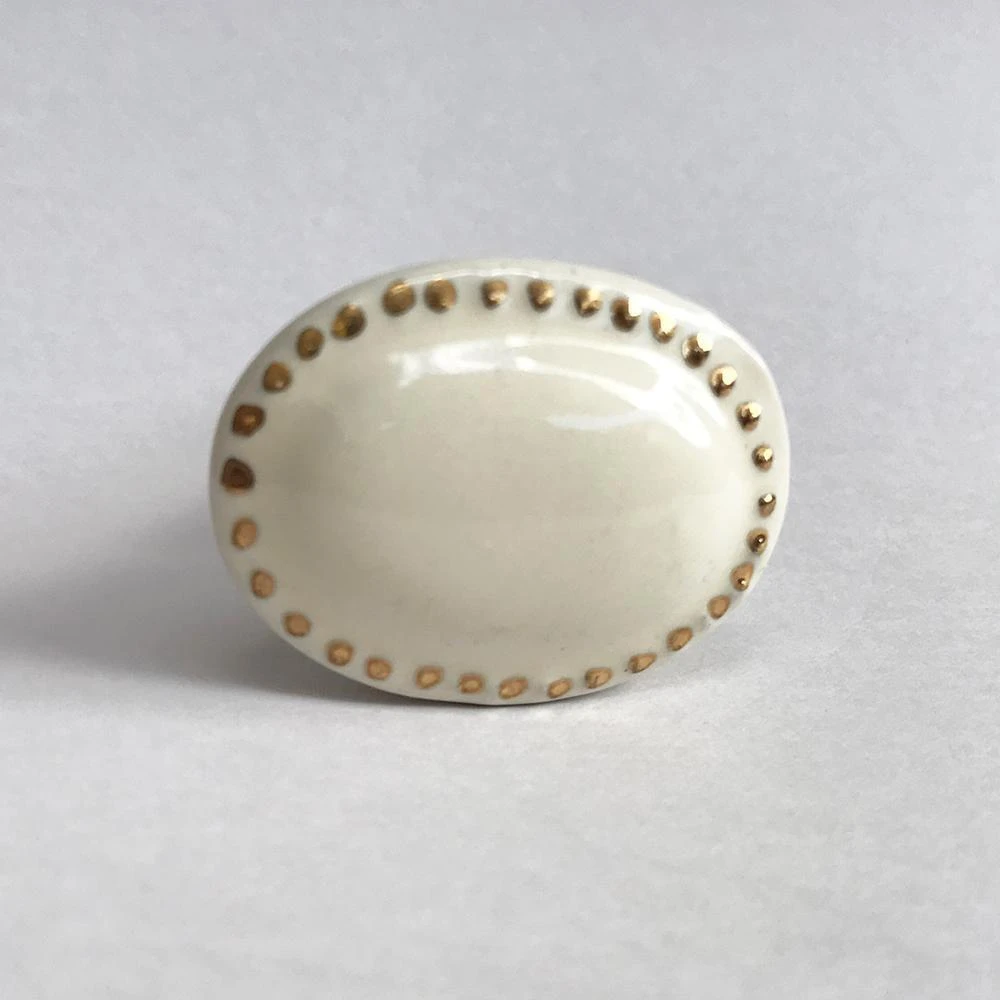 Decorative Drawer Pull – a delicate halo of gold dots on ivory ceramic knob. Beautifully designed, this dresser pull will make your heart happy! It is the perfect finishing touch to your master bedroom or kitchen renovation. Handmade. (Halo knob pictured with our Cloud and Sophie Crystal knob.)