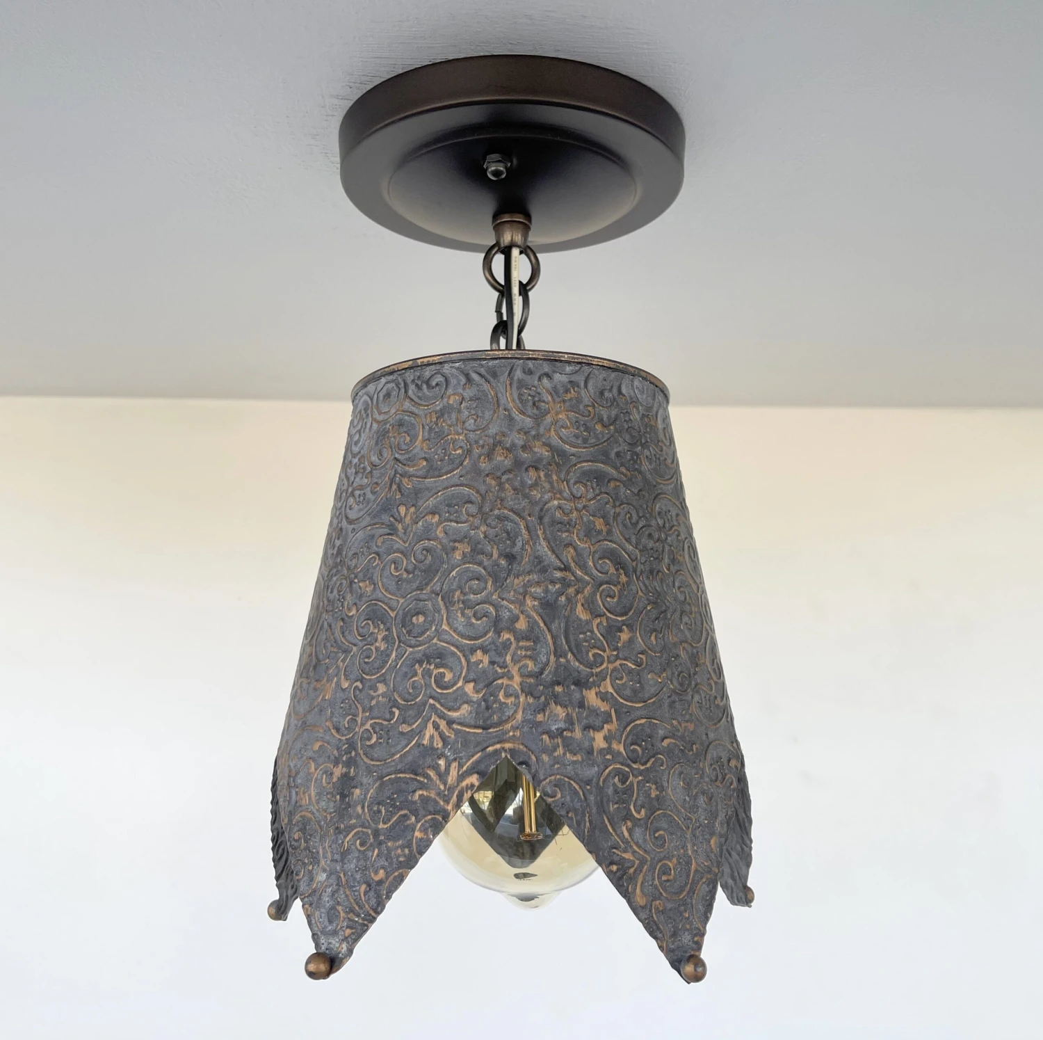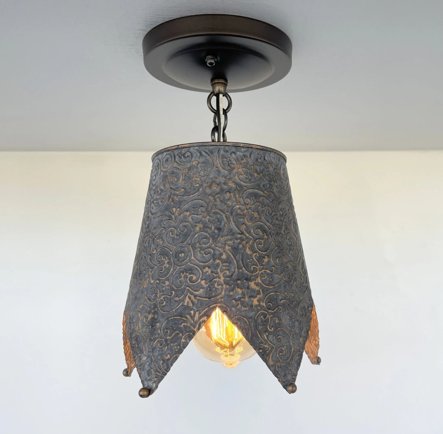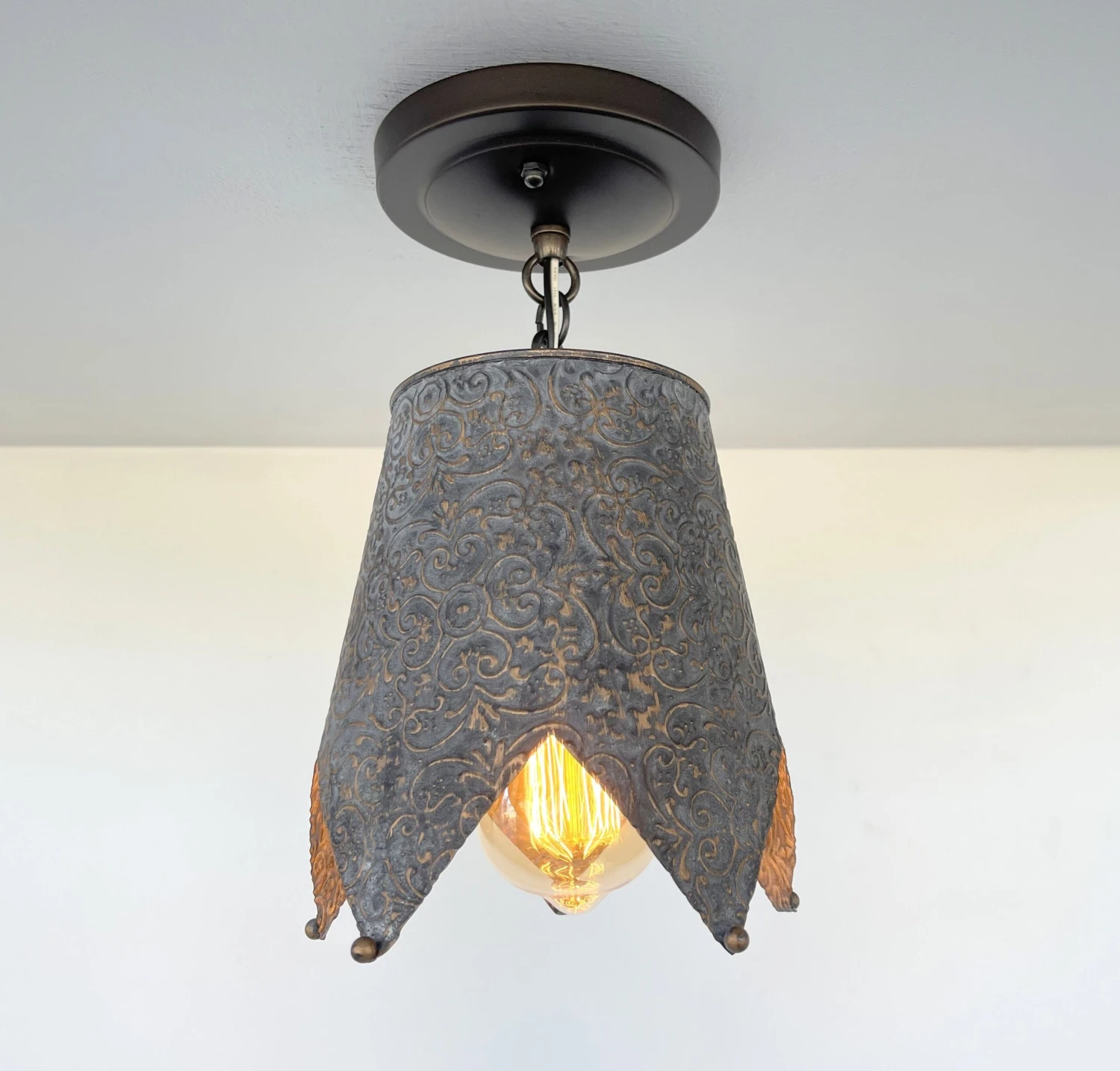 - 6″ wide x 10″tall Ornate Barn Metal Ceiling Light