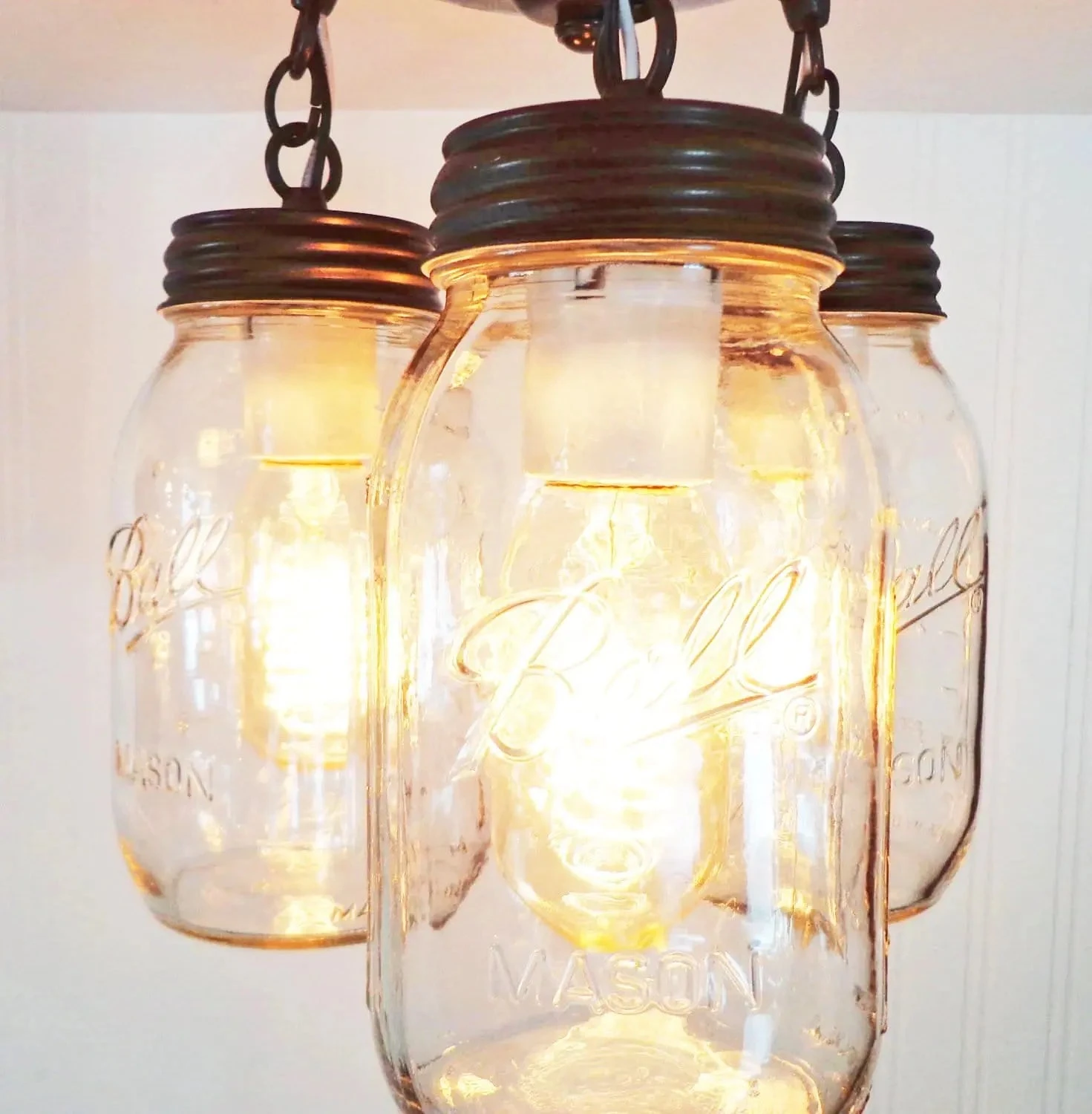 This handcrafted mason jar chandelier ceiling light features a trio of clear, quart-size, mason jars— the authenticity of each mason jar pendant shows its trademark raised lettering. Install in your farmhouse kitchen or over your bathroom vanity for unique mason jar lighting.