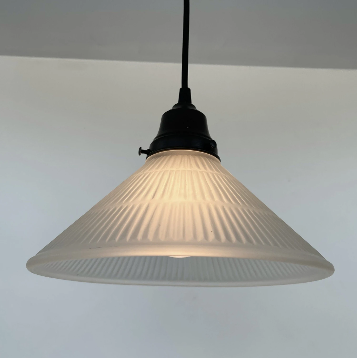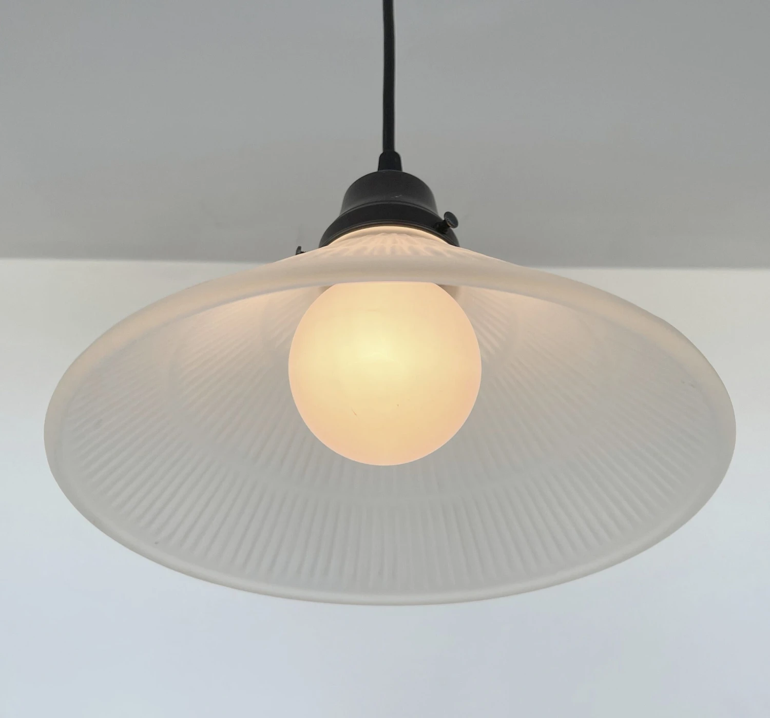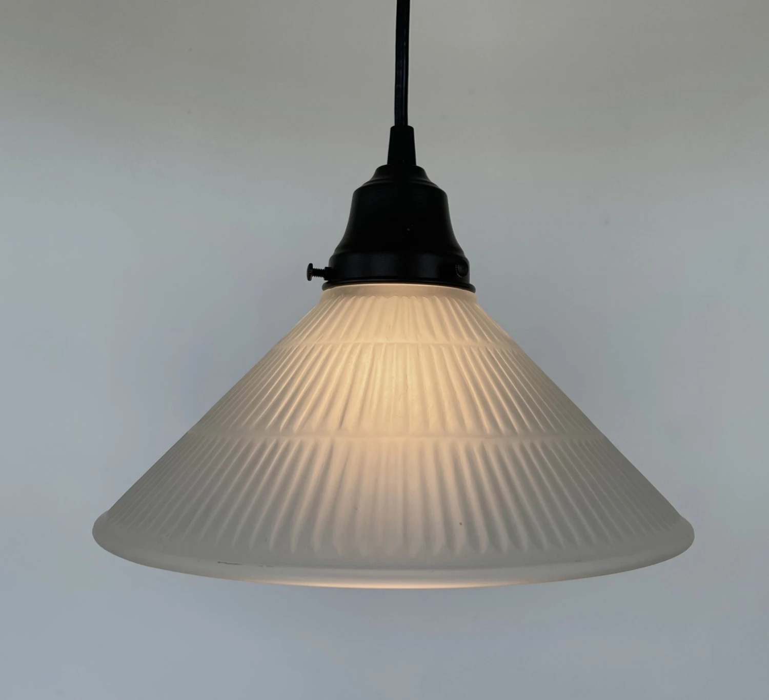 This modern styled holophane shade from the 1980’s has been transformed into a sophisticated pendant suited for over a sink, table or island lighting idea. The heavy quality glass keeps the light bulb form glaring into your eyes, yet the open bottom gives exceptional illumination on the surface below.