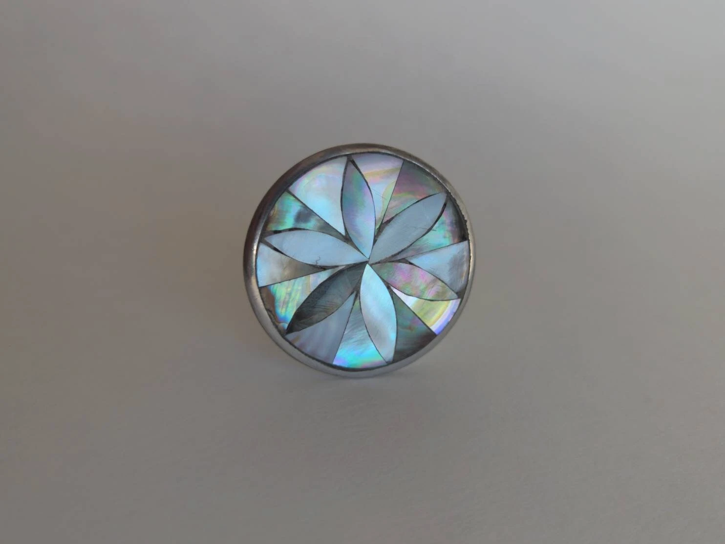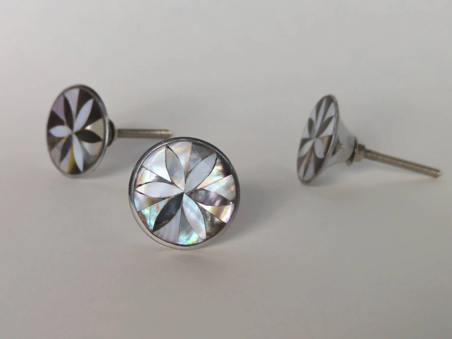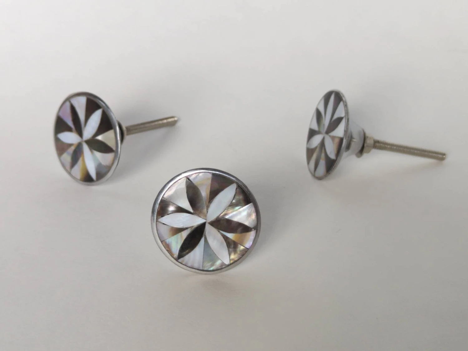 Shimmering black mother of pearl seashell inlay. Â These gorgeous handmade knobs are both elegant and chic. The perfect drawer pull for your shabby chic home remodel!