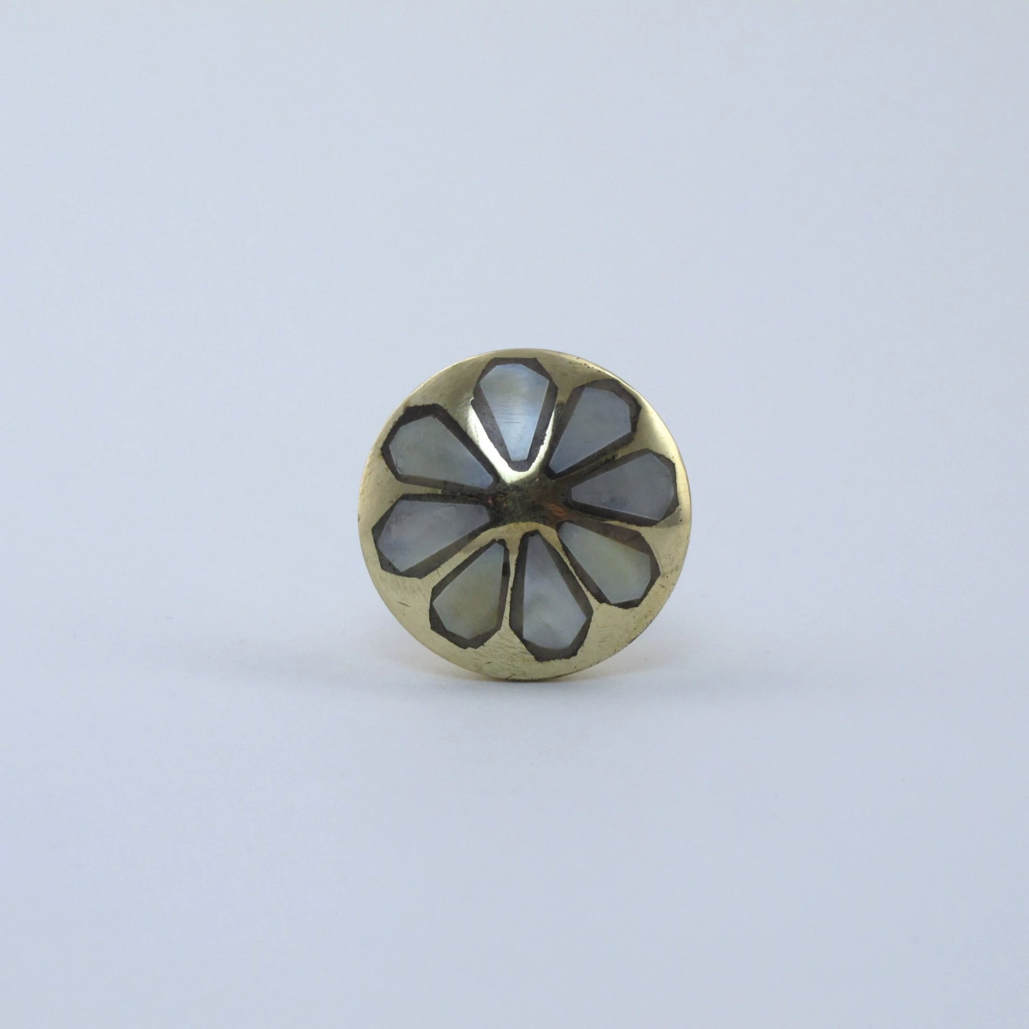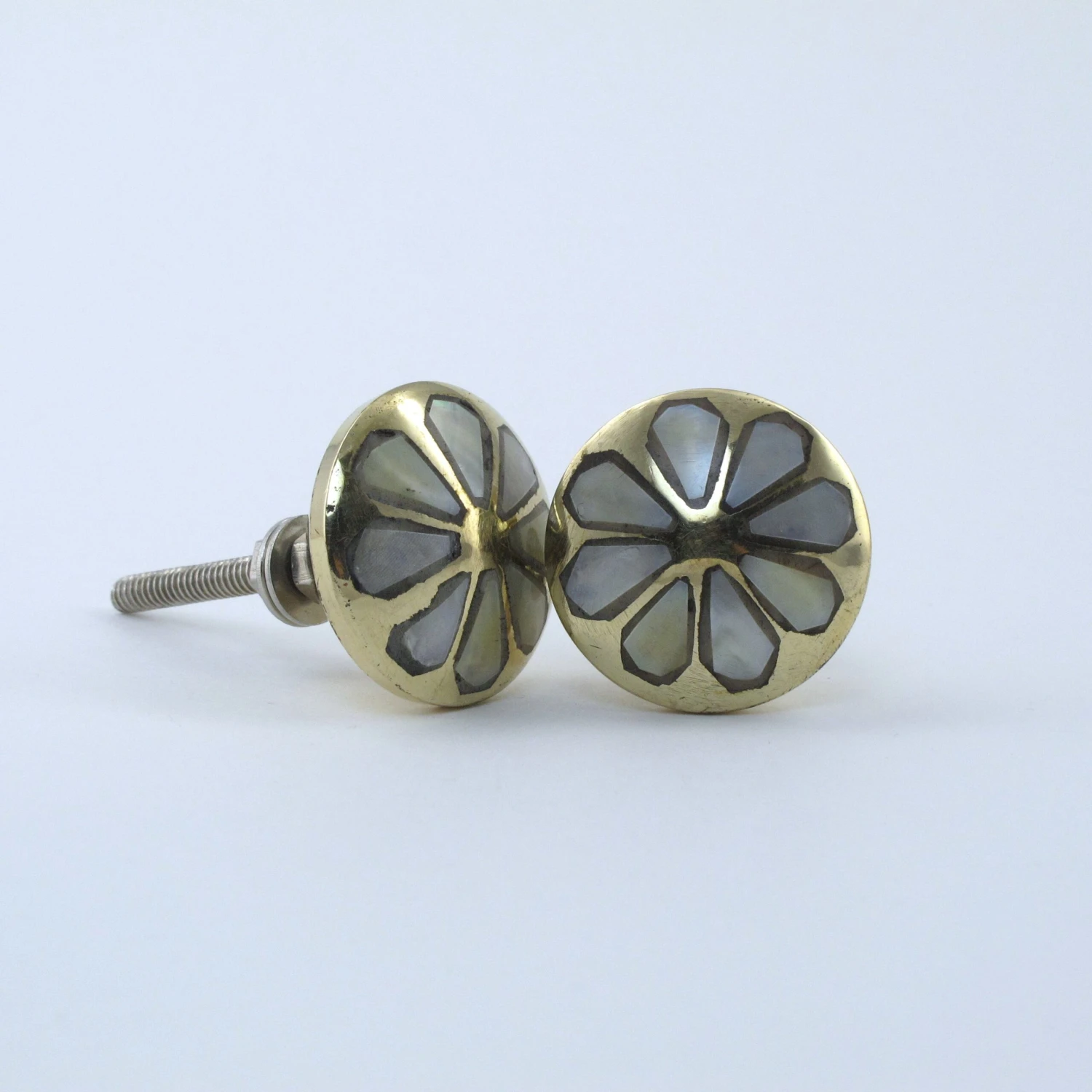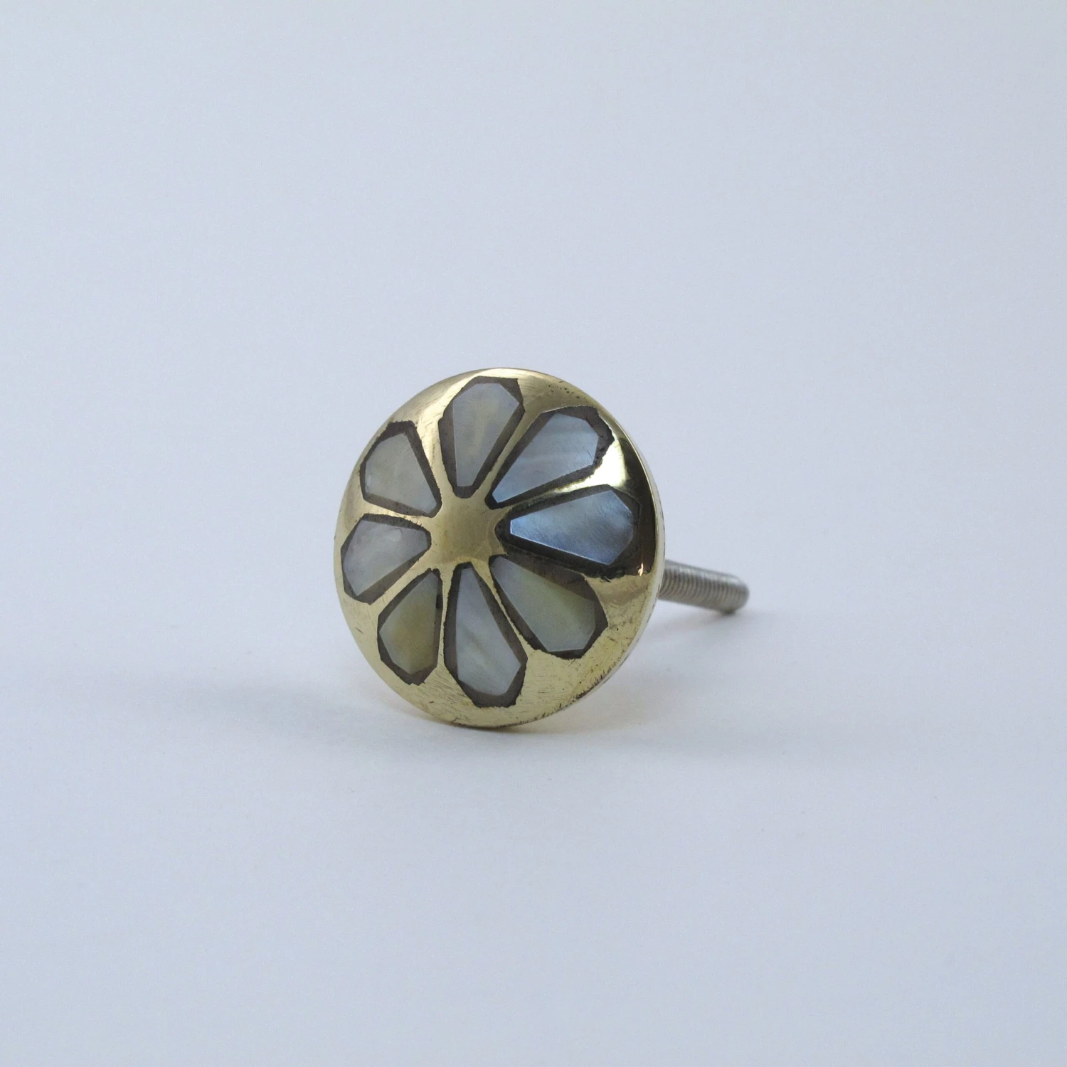 Mother of Pearl Daisy Knob is made with brass, gold, metal, and mother of pearl seashell. This knob features faceted pieces of mother of pearl designed in a daisy floral shape, accented in gold. Beautifully designed this is a knob that will add that little extra something to those cabinets you’ve been wanting to spruce up. Our mother of pearl knobs are very well made and perfect for any high-use areas. Â