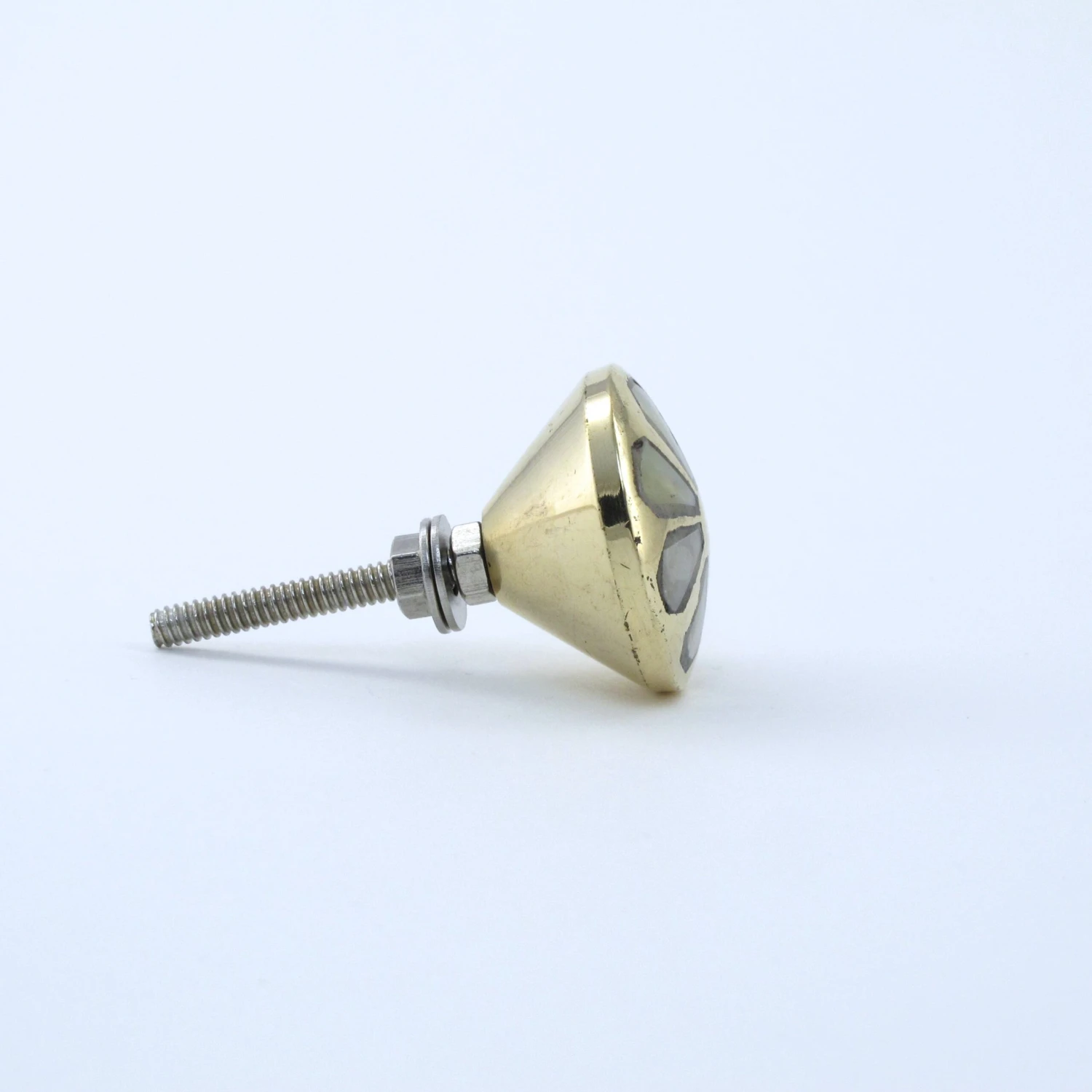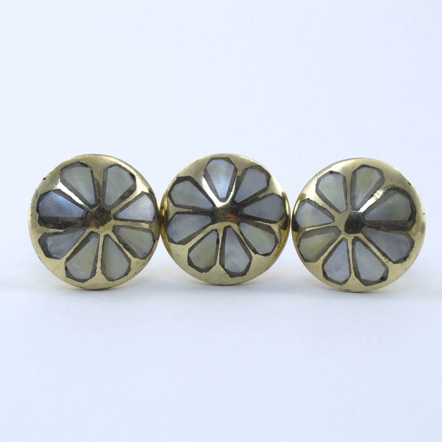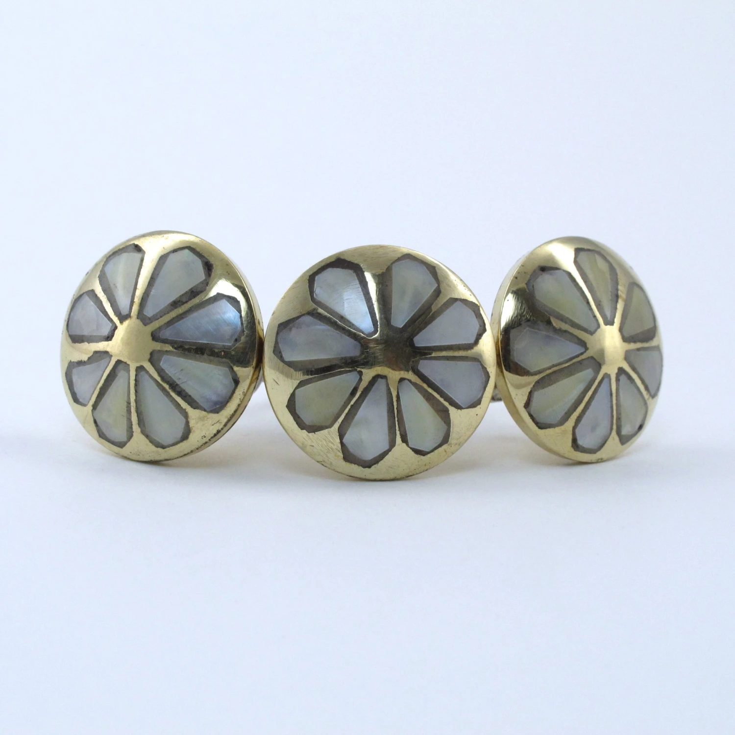 Mother of Pearl Daisy Knob is made with brass, gold, metal, and mother of pearl seashell. This knob features faceted pieces of mother of pearl designed in a daisy floral shape, accented in gold. Beautifully designed this is a knob that will add that little extra something to those cabinets you’ve been wanting to spruce up. Our mother of pearl knobs are very well made and perfect for any high-use areas. Â