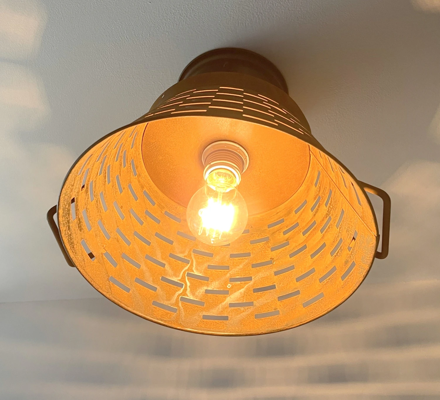 Rustic farmhouse lighting exuberates from this authentic pierced metal with a gorgeous rusty barn finish. Install it for your farmhouse bathroom light fixtures or over your kitchen sink for a truly industrial style idea. Look at the dramatic light patterns on the ceiling and adjoining wall. Wow!!