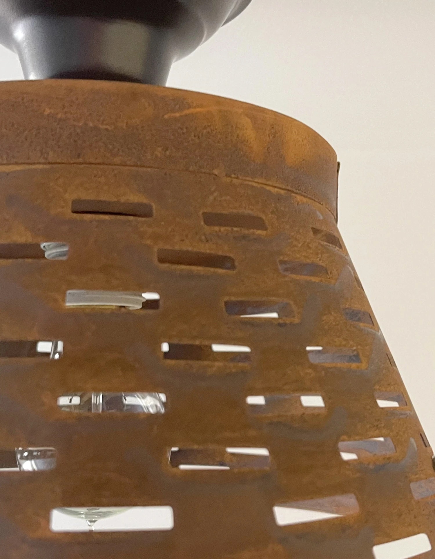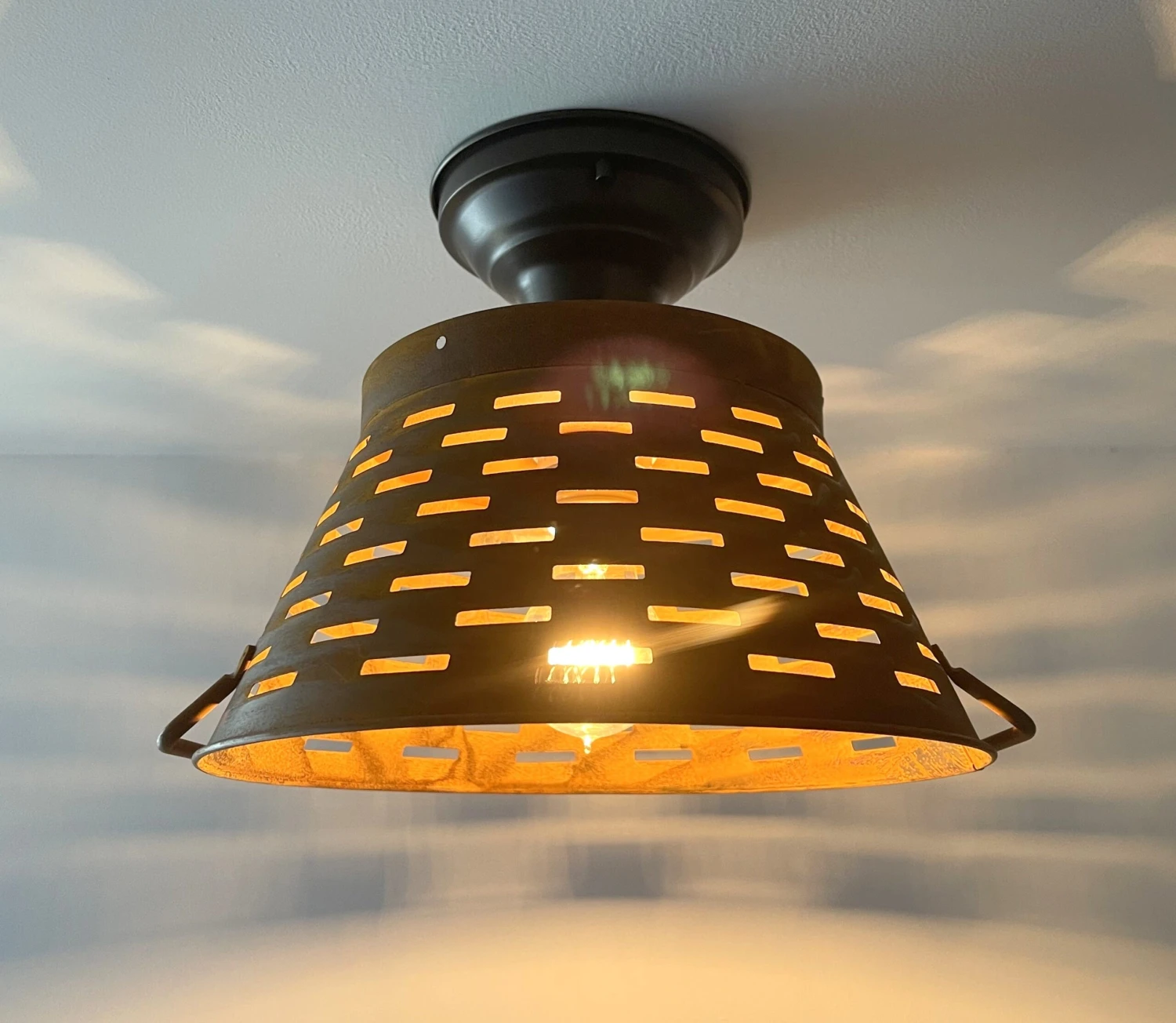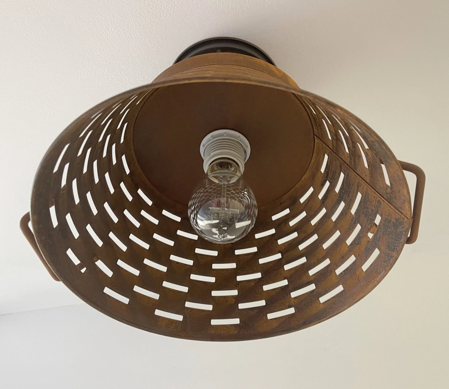 - 13.5″ wide x 10″tall Rusty Metal Pierced Basket Semi Flush Light