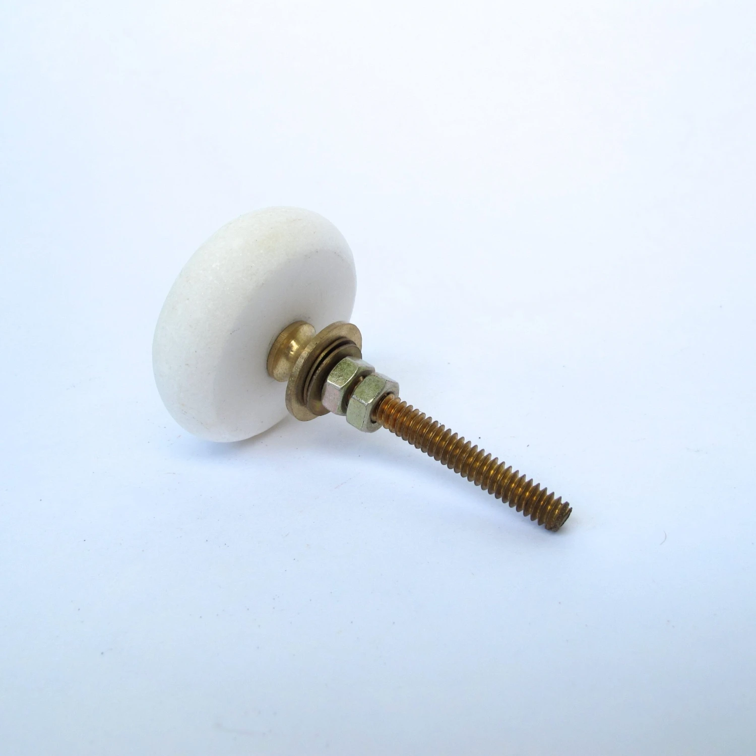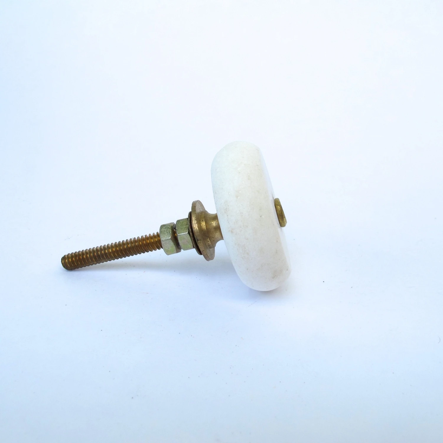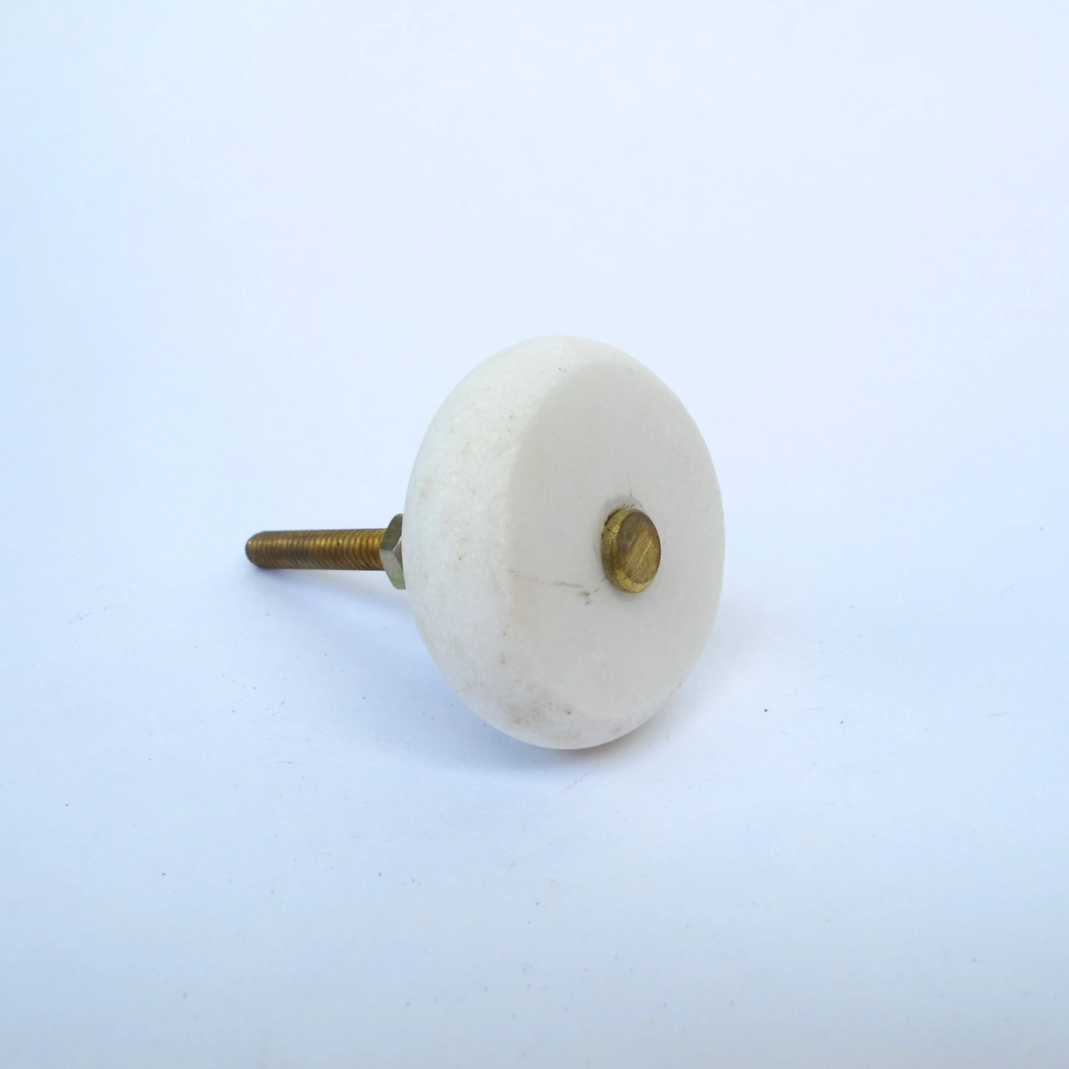 Round White Stone Knob with gold center is a high-quality stone knob beautifully handcrafted with a brushed gold center accent. Handmade, each knob may vary ever so slightly. This knob has a heavier feel and is lovely to the touch. The knob is made with a white stone that has softly rounded edges. A beautiful dresser or cabinet knob, very sturdy.