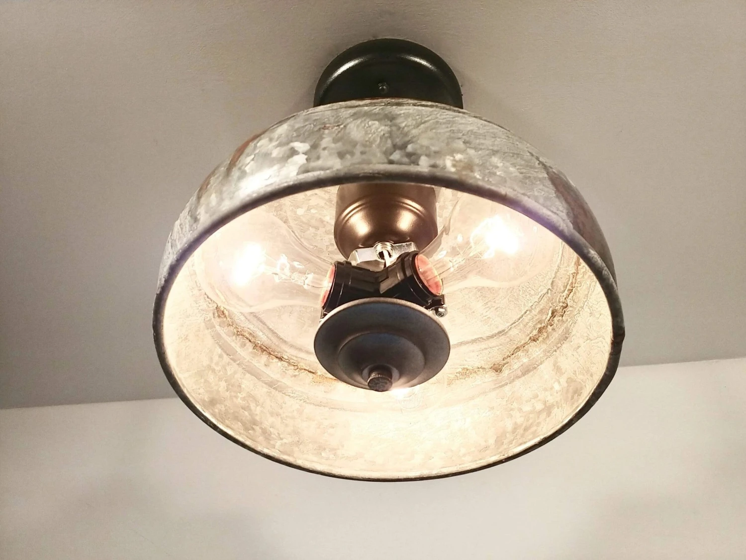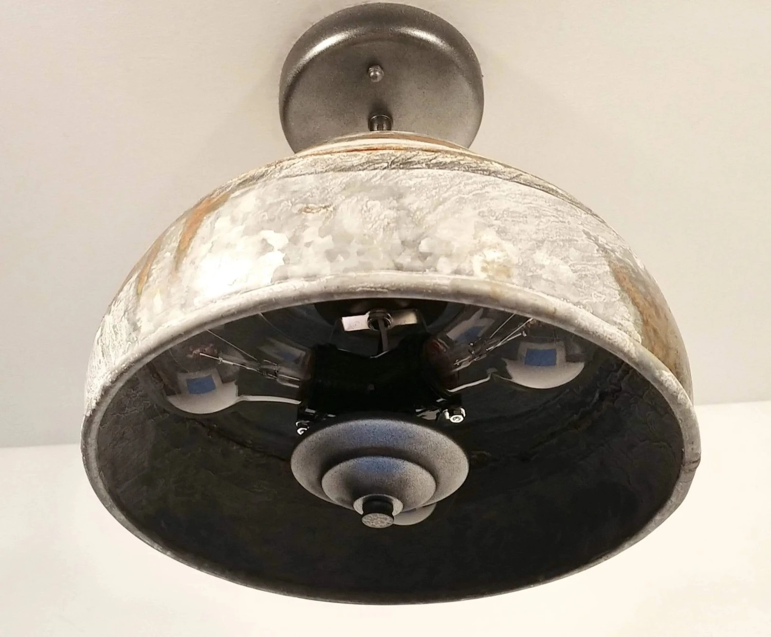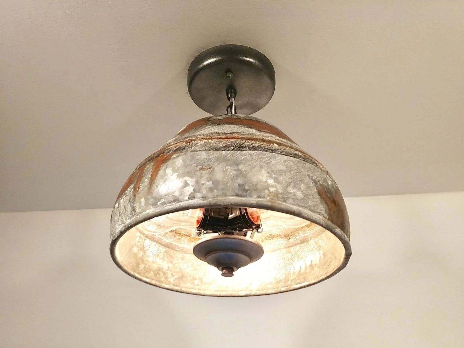 “A farmhouse original. Very heavy, high quality and unique. This rustic industrial farmhouse ceiling light has tons of character in the metal finish as each one is original.