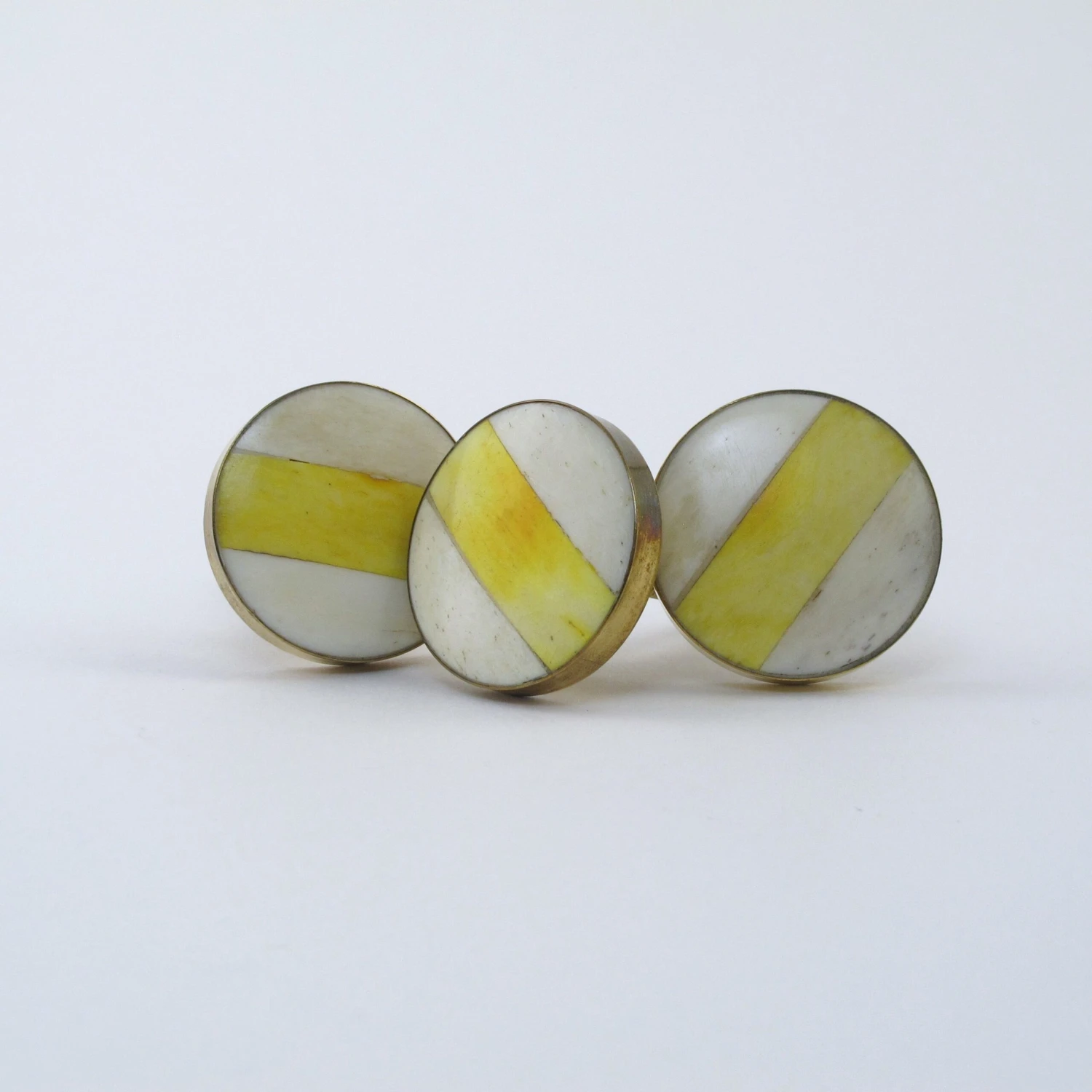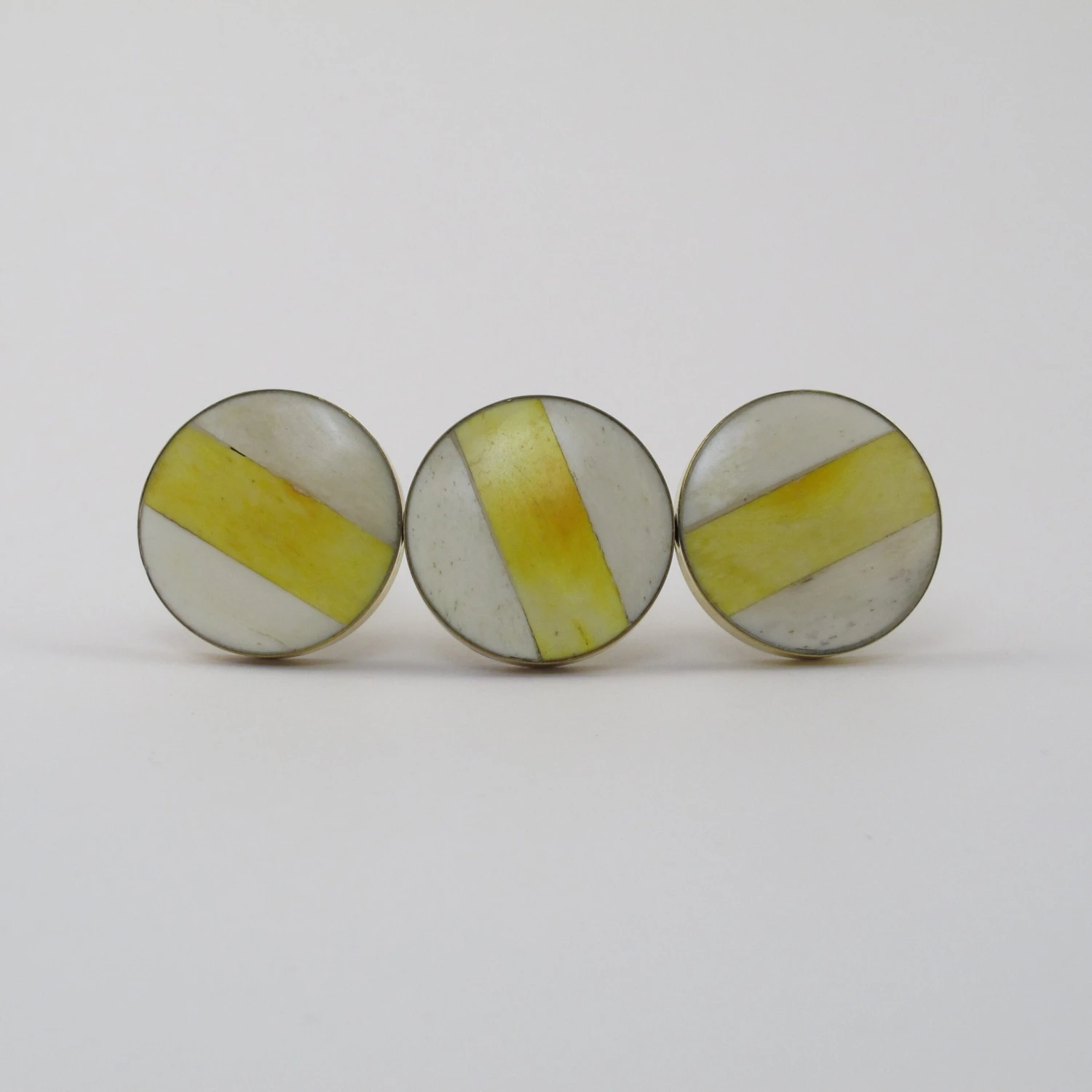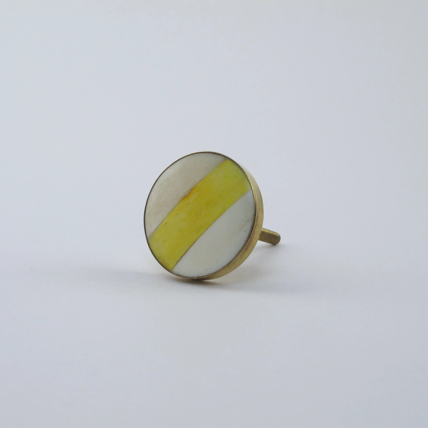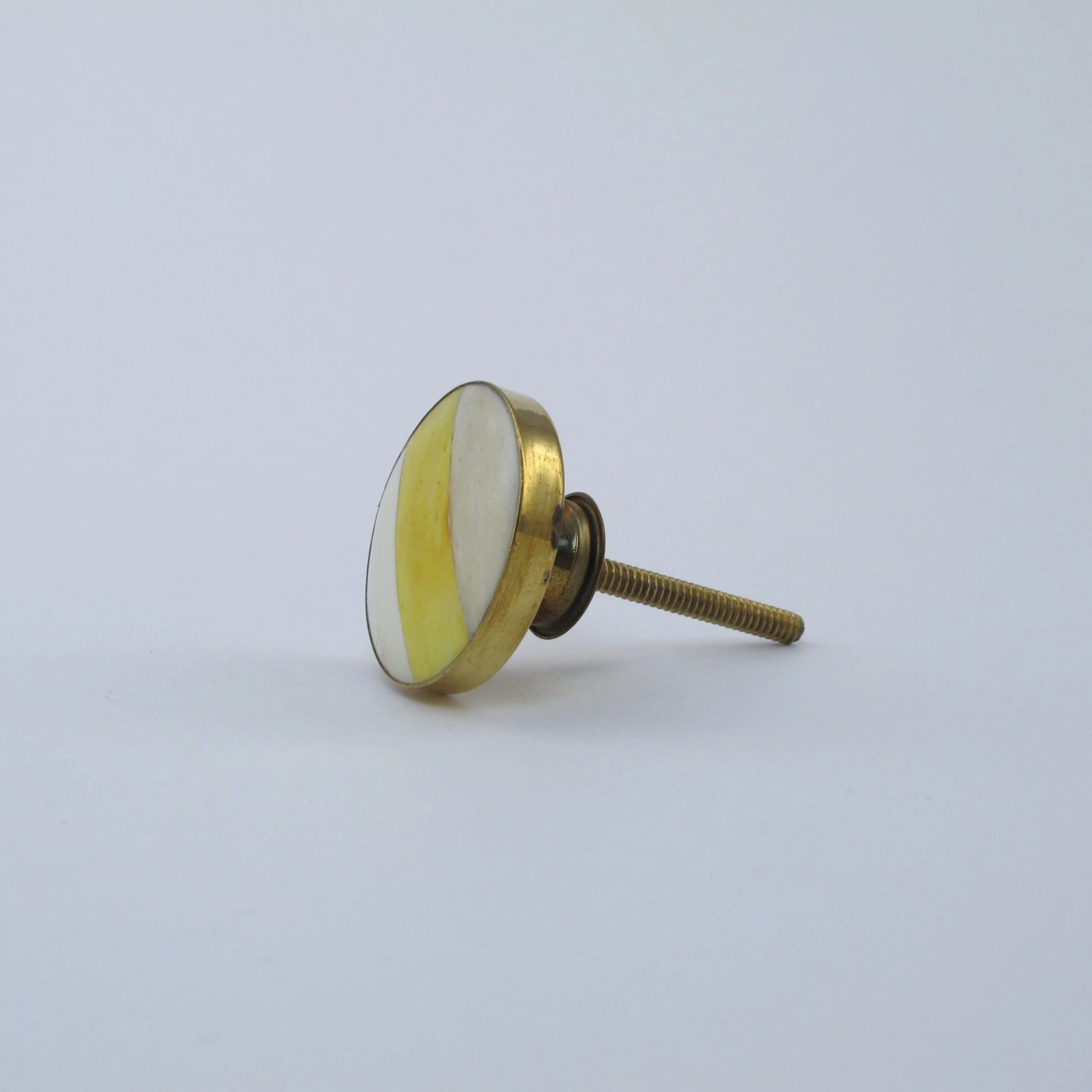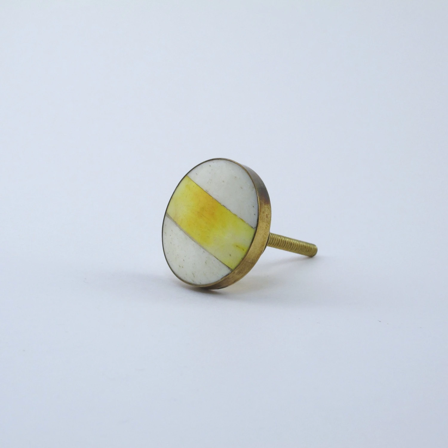 Sand Dunes Yellow Stripe Knob is an ivory colored dresser knob with a fun yellow stripe down the center. Handcrafted, each design is ever-so-slightly different and oh-so-beautiful. Gold metal edging and trim. This knob is brand new and the perfect knob for your kitchen remodel or dresser drawers. Bright and bold, with a natural feel, this one is sure to be a best-seller!