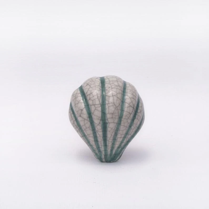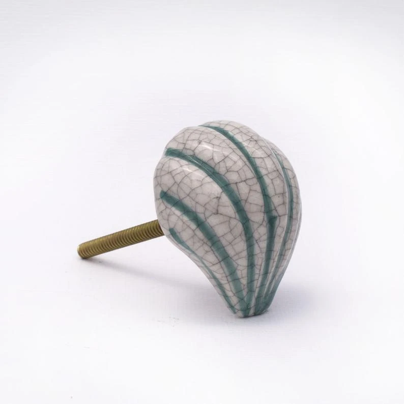 Seashell Knob. Ceramic glazed, white with pale blue stripes. A beautiful knob for a kitchen cabinet, dresser drawer or bathroom. Unique and one of a kind. Handmade.Â