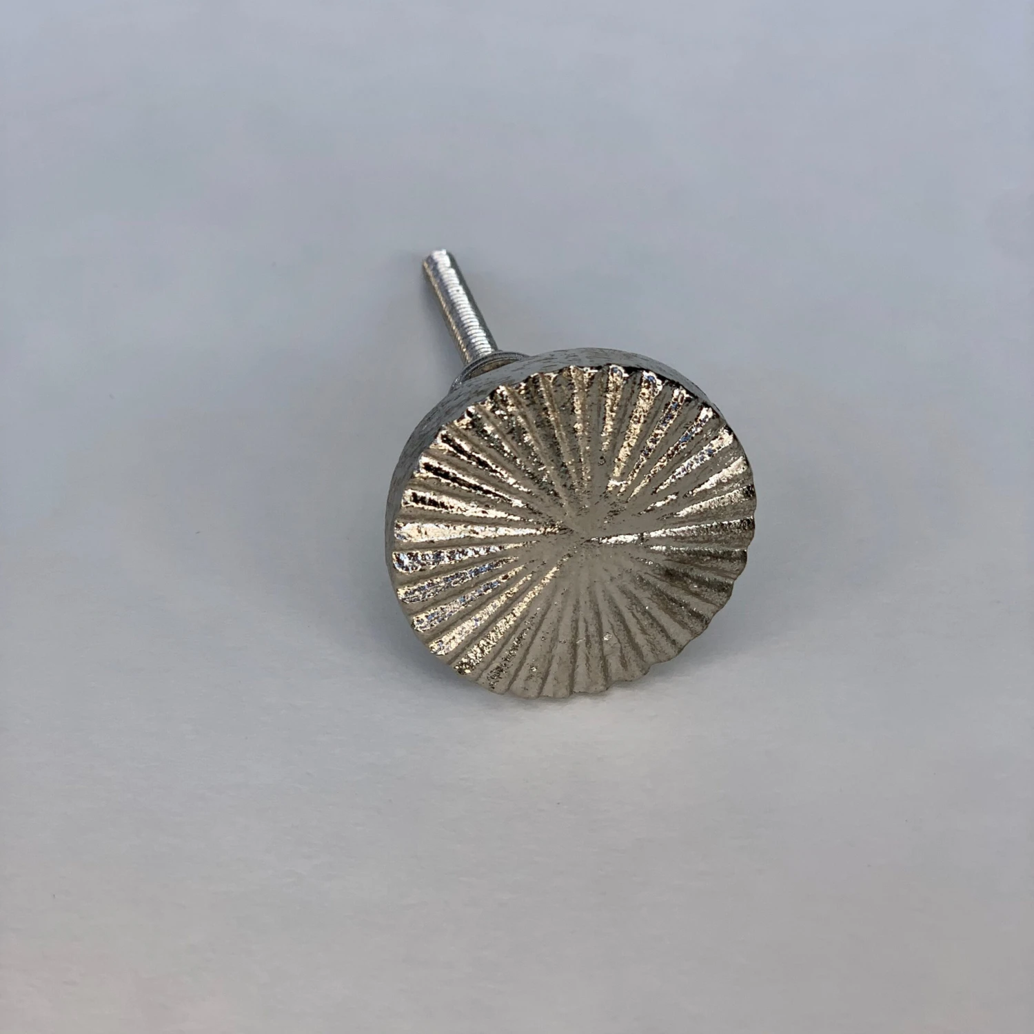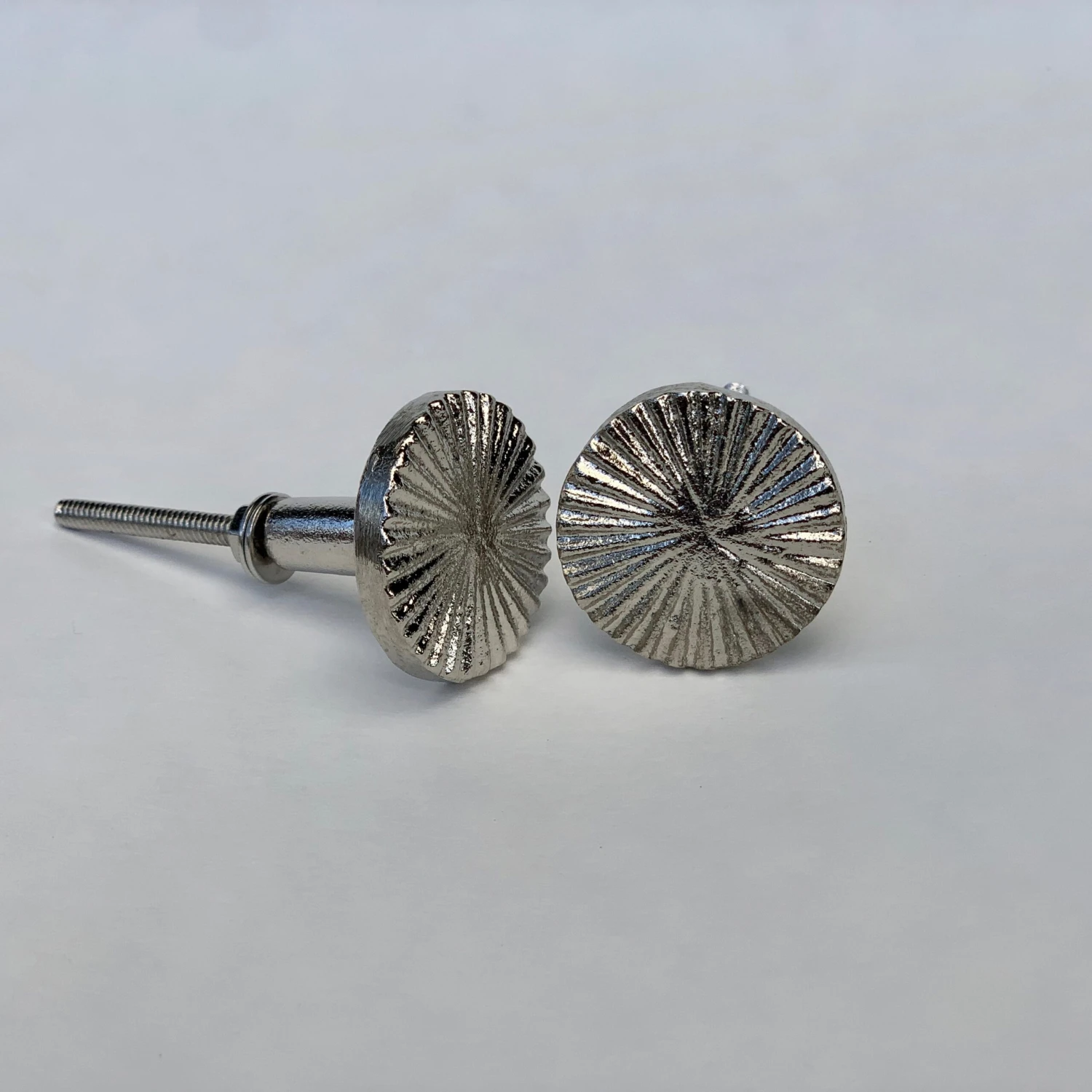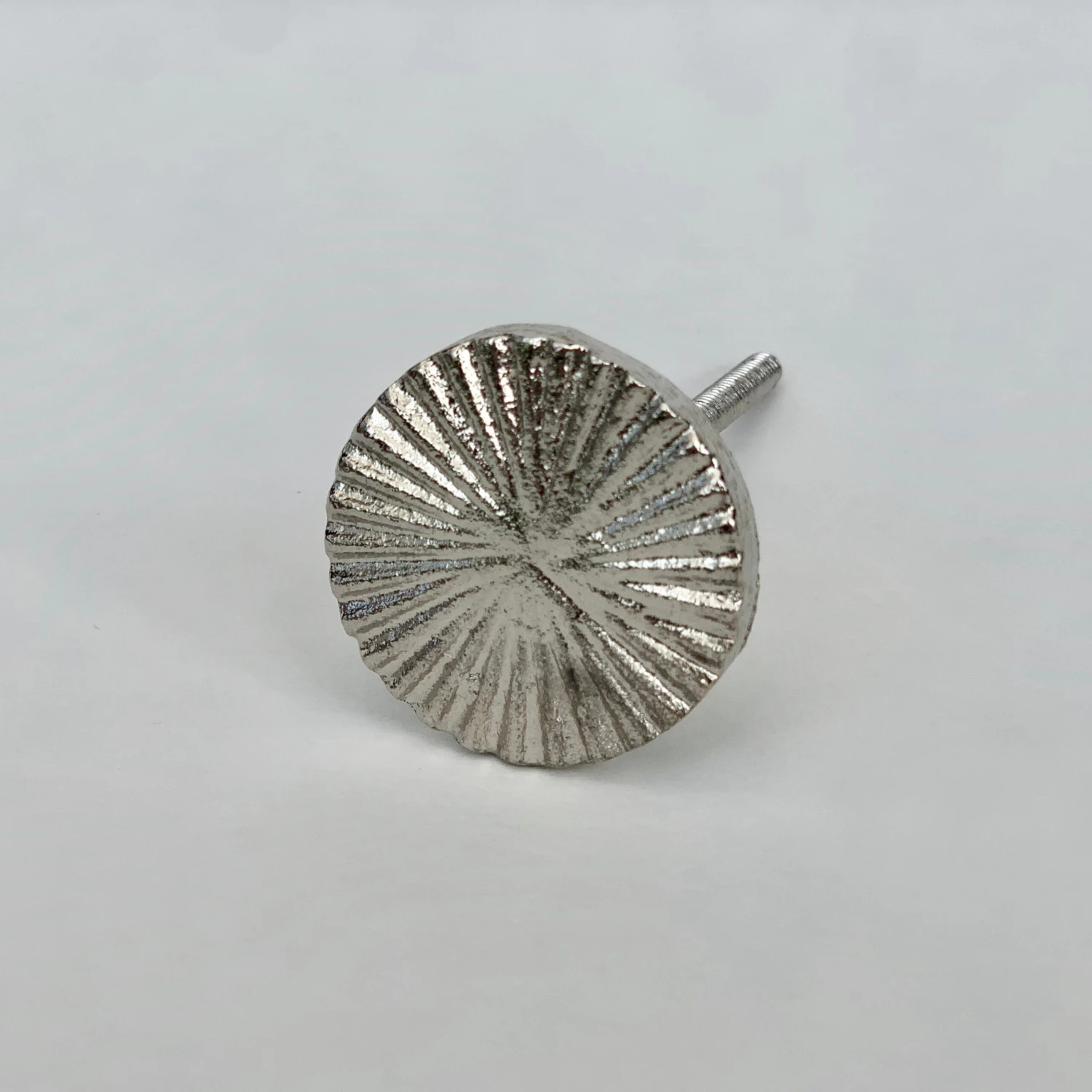 The Silver Radial Knob. A beautiful silver round metal knob with a wavy, radial design that feels modern and elegant. The perfect knob for dressers or side tables. It adds sophistication in a stylish, fun way! Made of solid silver, this knob is very sturdy and has a high-quality finish and feel. Knobs are sold individually. Also available in Gold!
