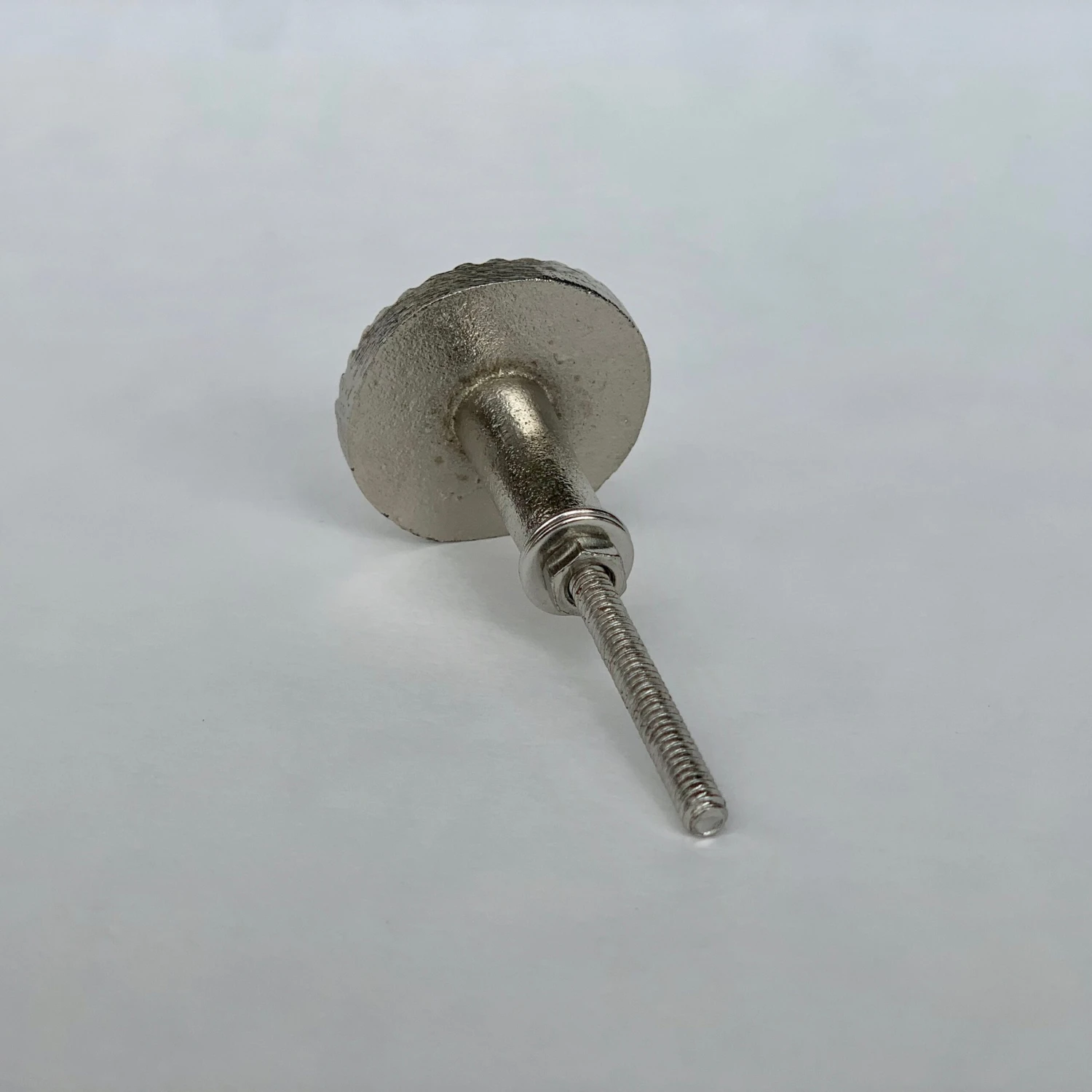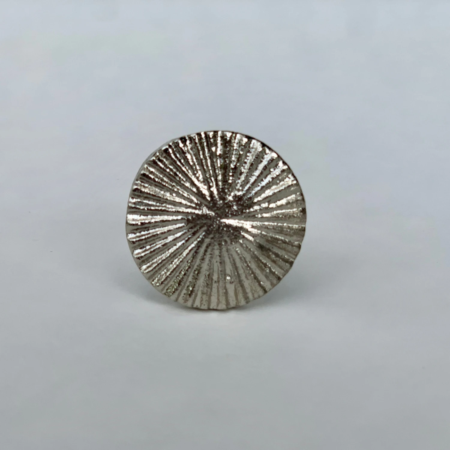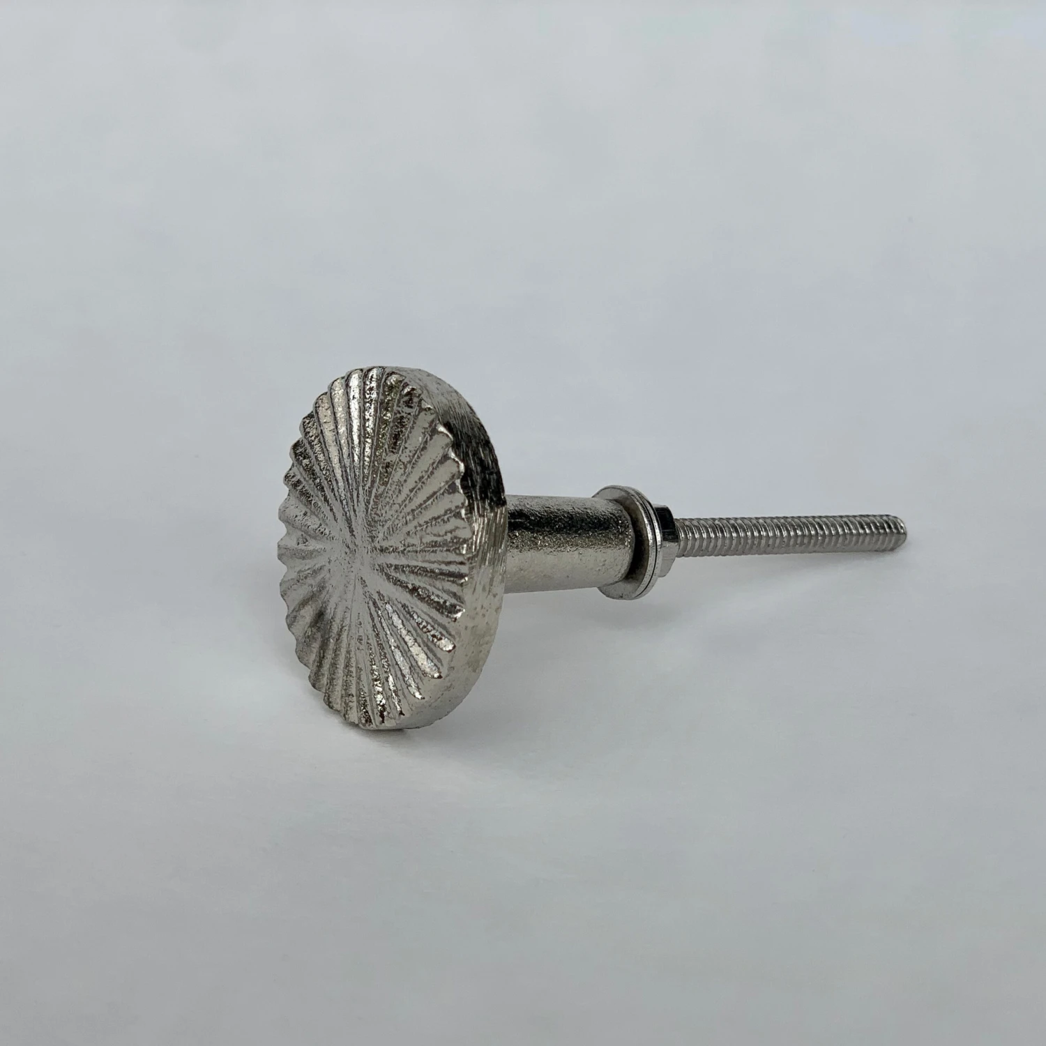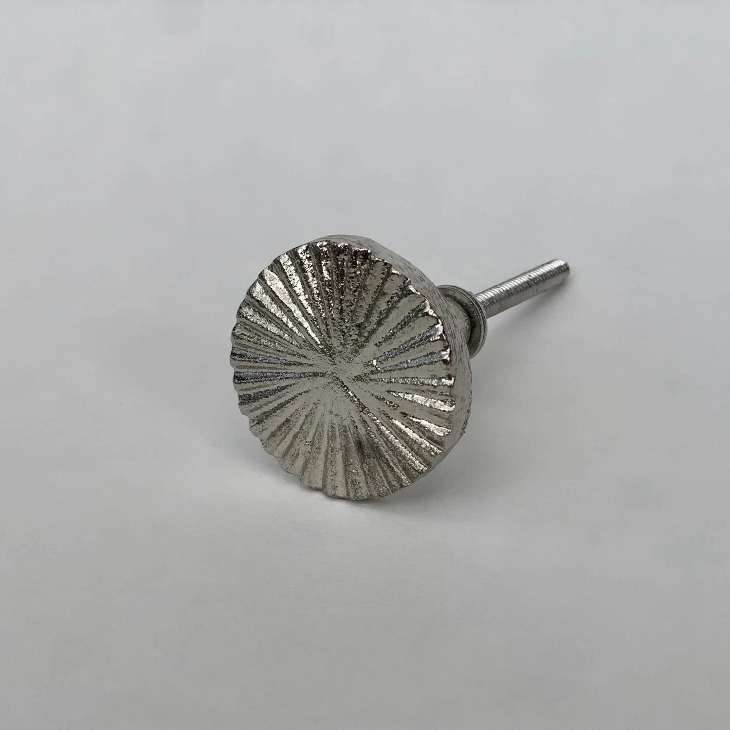 The Silver Radial Knob. A beautiful silver round metal knob with a wavy, radial design that feels modern and elegant. The perfect knob for dressers or side tables. It adds sophistication in a stylish, fun way! Made of solid silver, this knob is very sturdy and has a high-quality finish and feel. Knobs are sold individually. Also available in Gold!