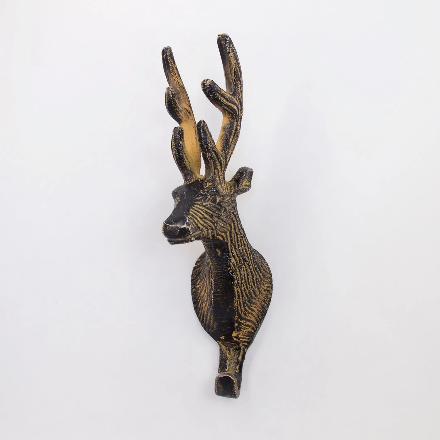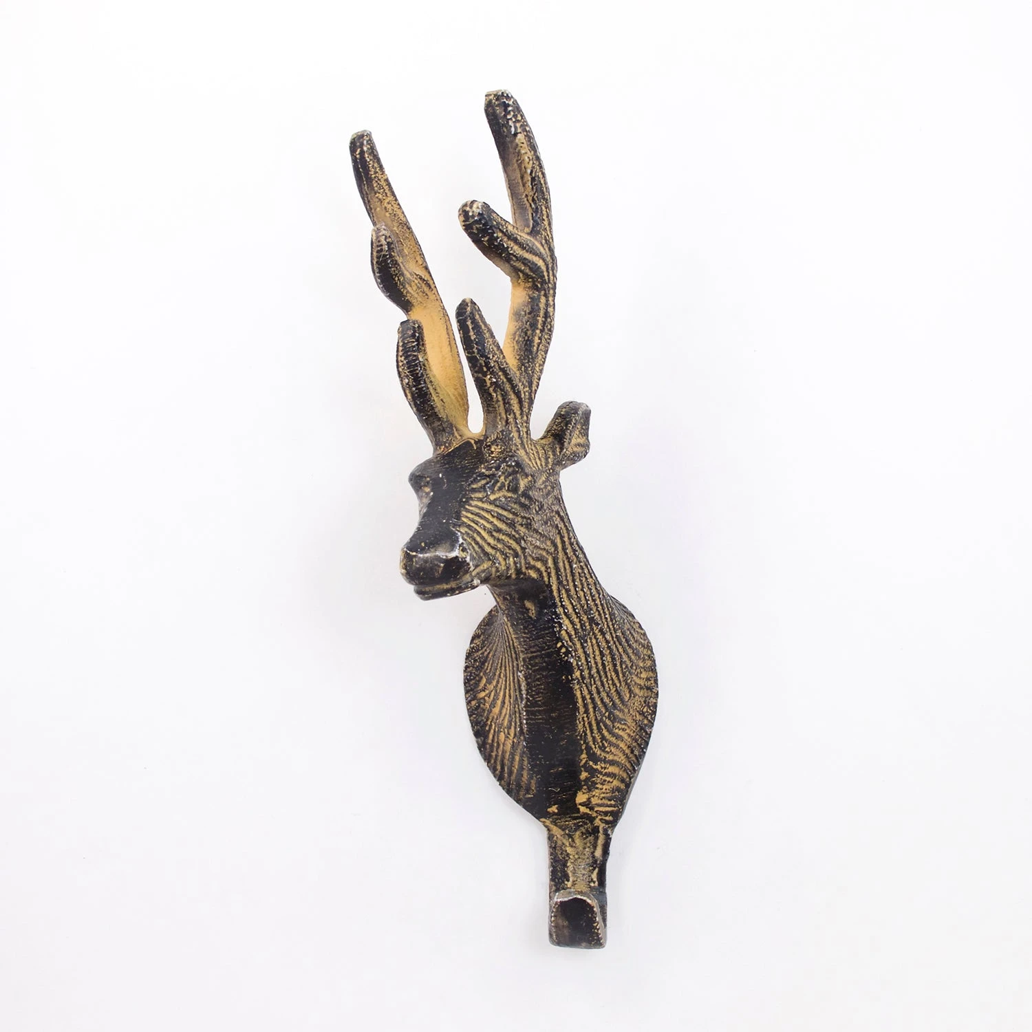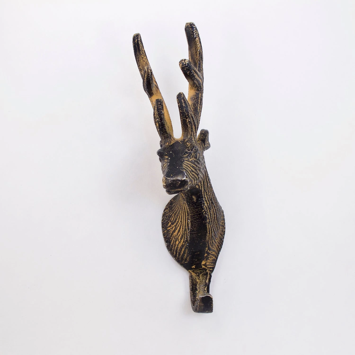The Reindeer Hook is a beautifully designed, large wall hook. It is made of solid metal but has a natural wood-like painted finish that gives it a rustic charm. This wall hook is definitely a statement piece as it measures 9 inches tall, projects out 4 inches and is 2 inches wide. A gorgeous hook perfect for backpacks, coats or bags. This is a one-of-a-kind piece of hardware that you are going to love! Handmade.Â