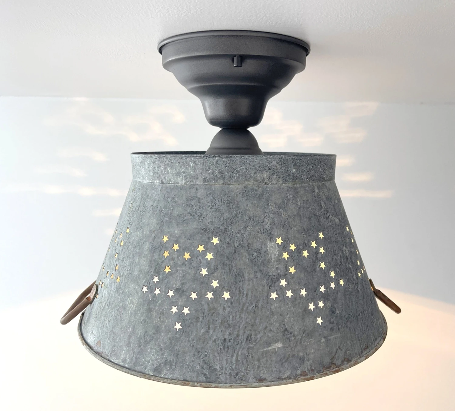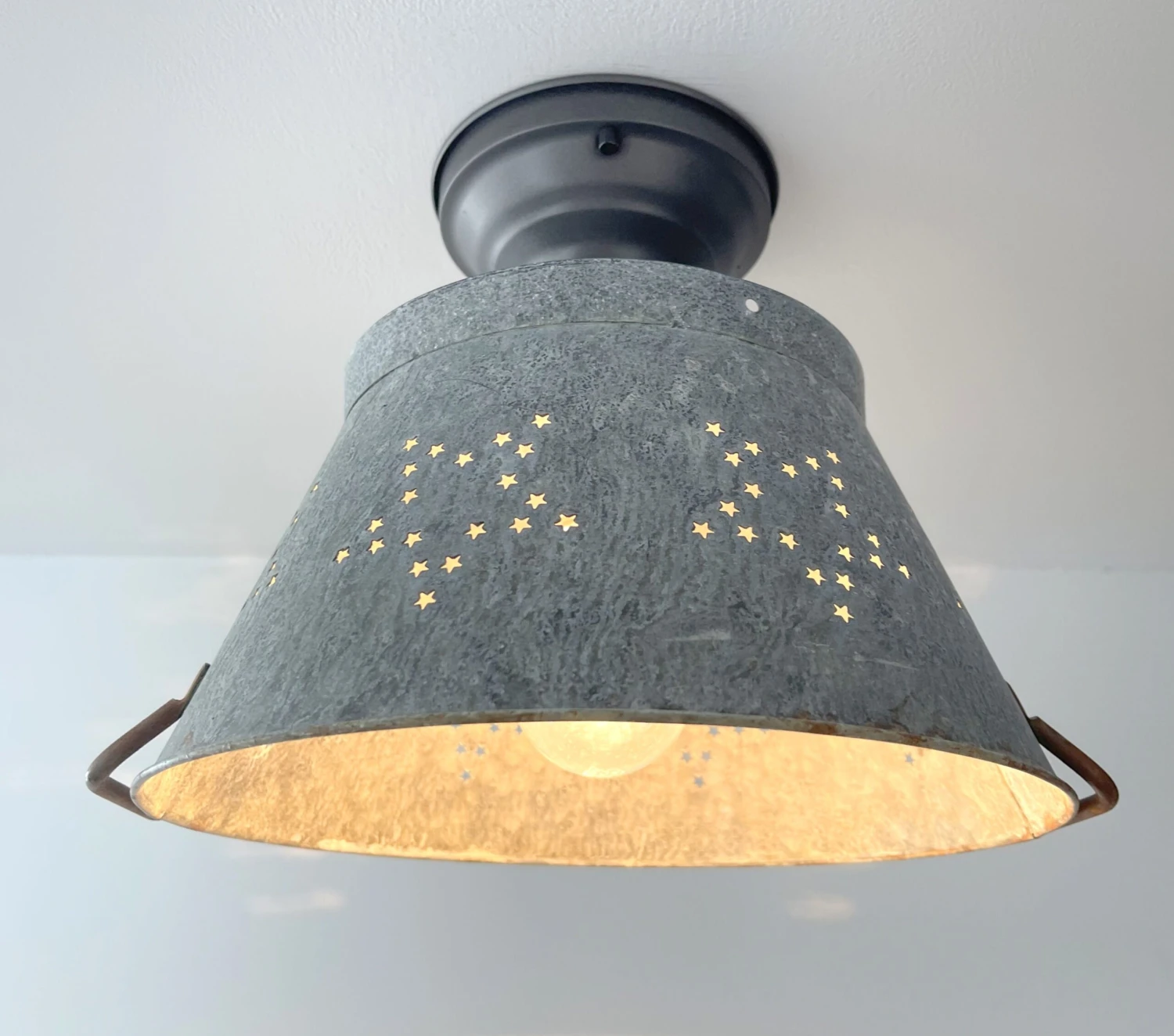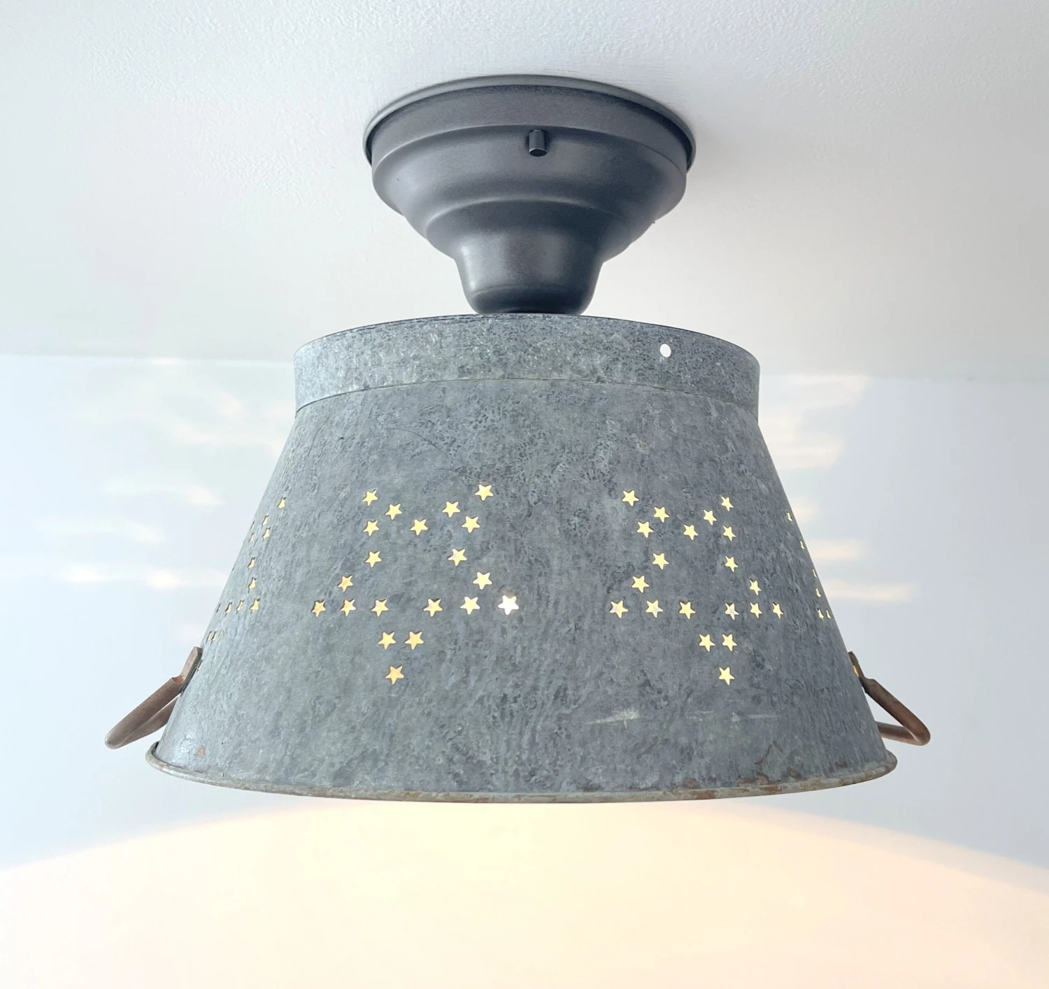 Beautifully weathered Star Colander creates the perfect farmhouse kitchen lighting for over your country kitchen sink or rustic kitchen island! Capture the relaxed galvanized ceiling light style with this patina star colander as a flush mount farmhouse light that allows a small glimpse of light through the ‘star’ and great illumination below.