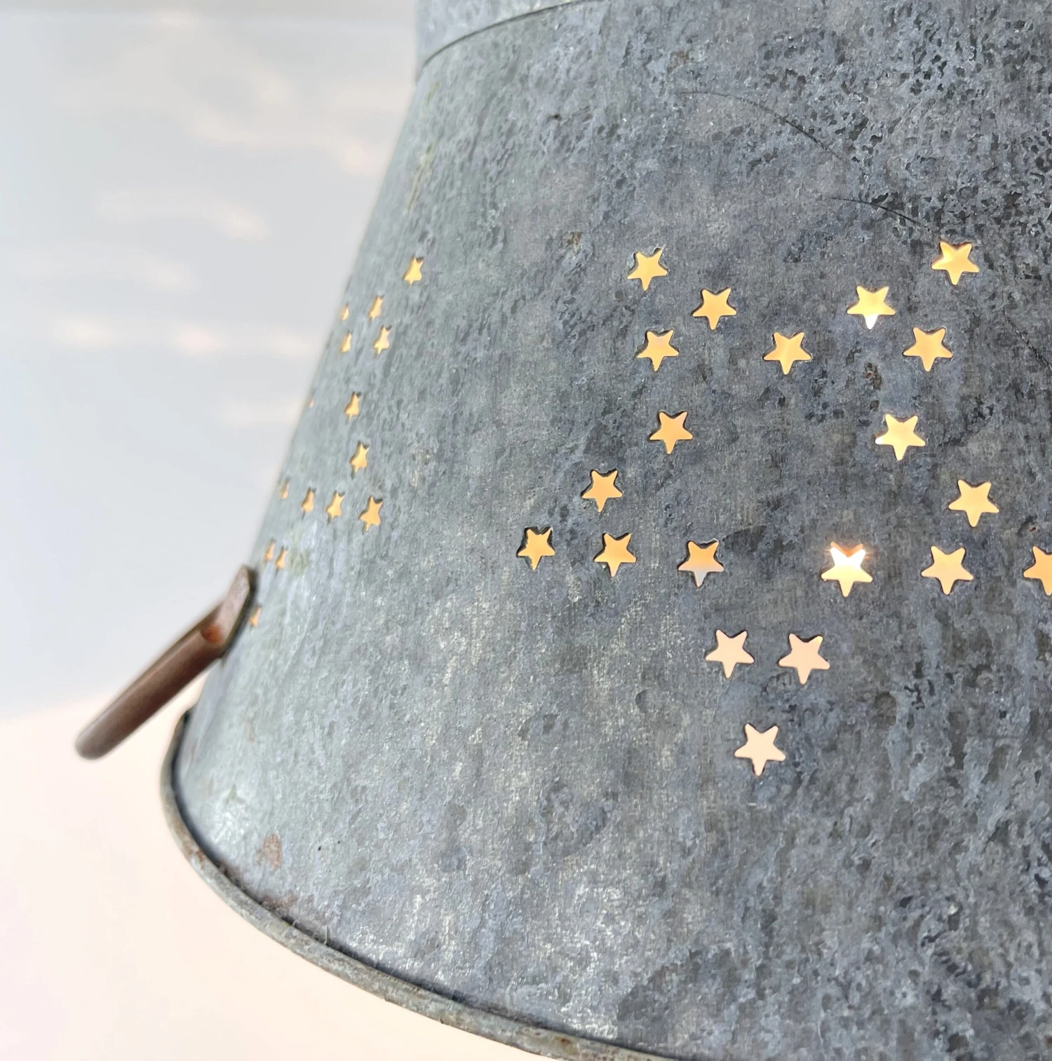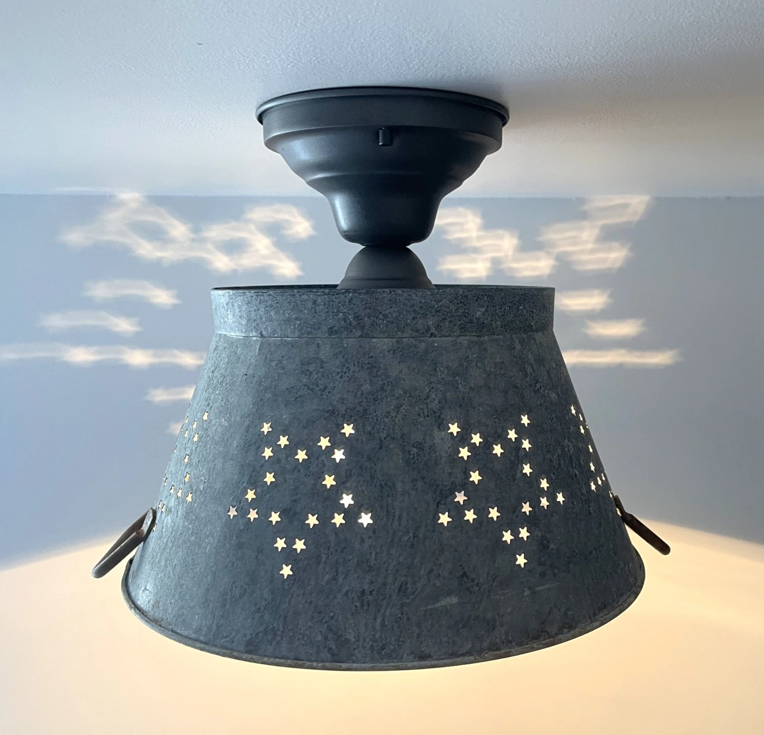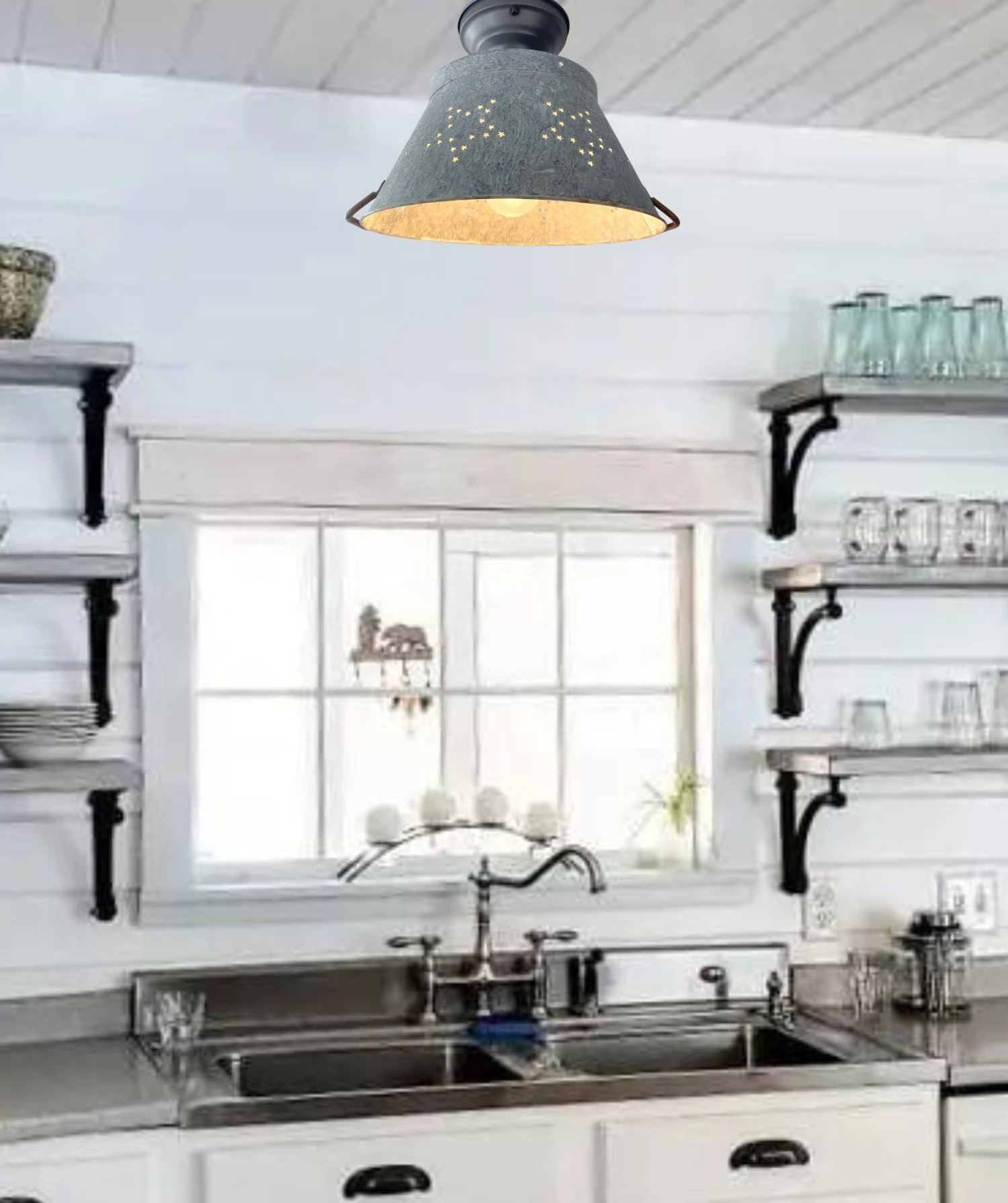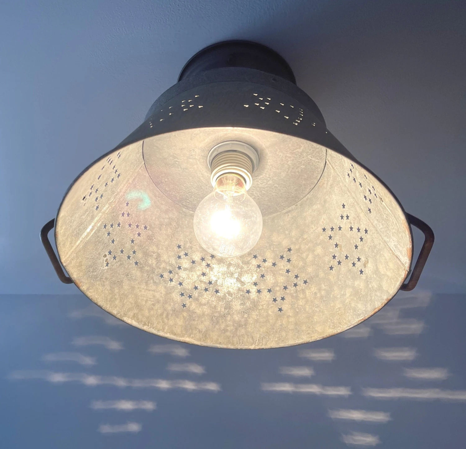 Beautifully weathered Star Colander creates the perfect farmhouse kitchen lighting for over your country kitchen sink or rustic kitchen island! Capture the relaxed galvanized ceiling light style with this patina star colander as a flush mount farmhouse light that allows a small glimpse of light through the ‘star’ and great illumination below.