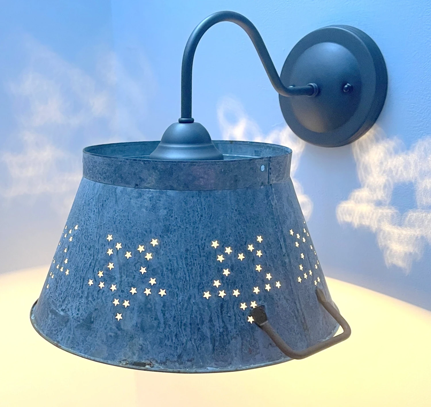 The perfect light for your farmhouse, bathroom or AirBnB with its casual and easy to live with weathered metal wall sconce light fixture look. The star light patterns abound on the wall and gives interest to the wall sconce lighting.