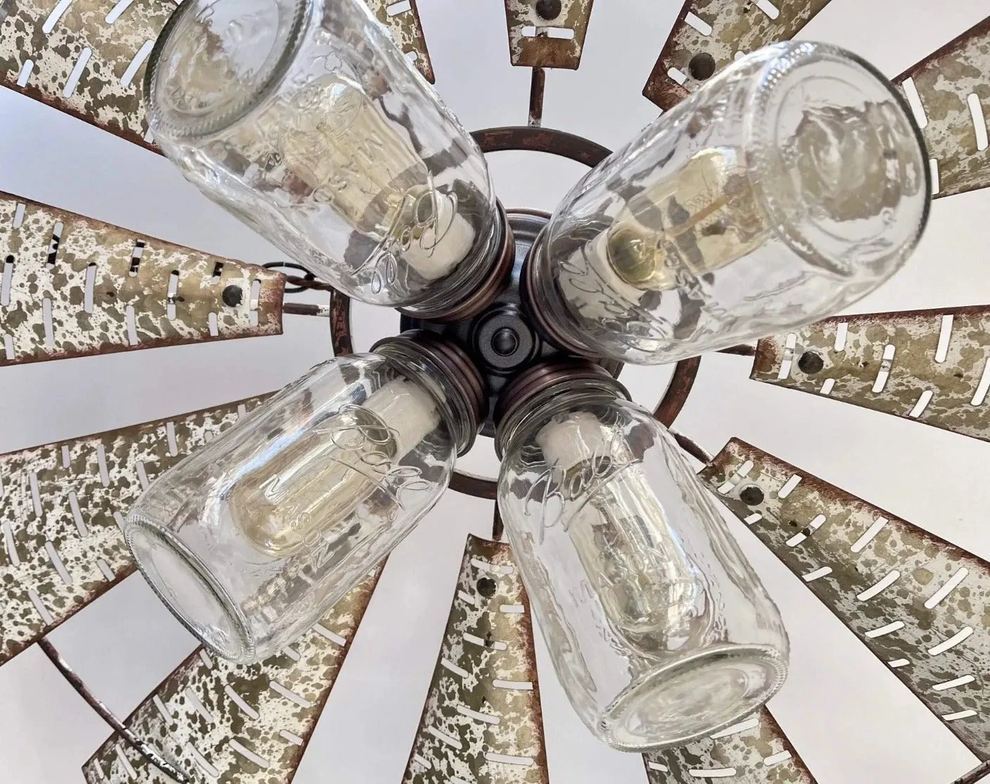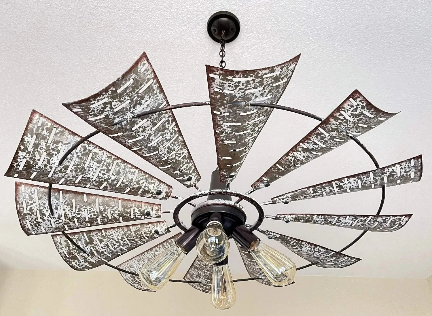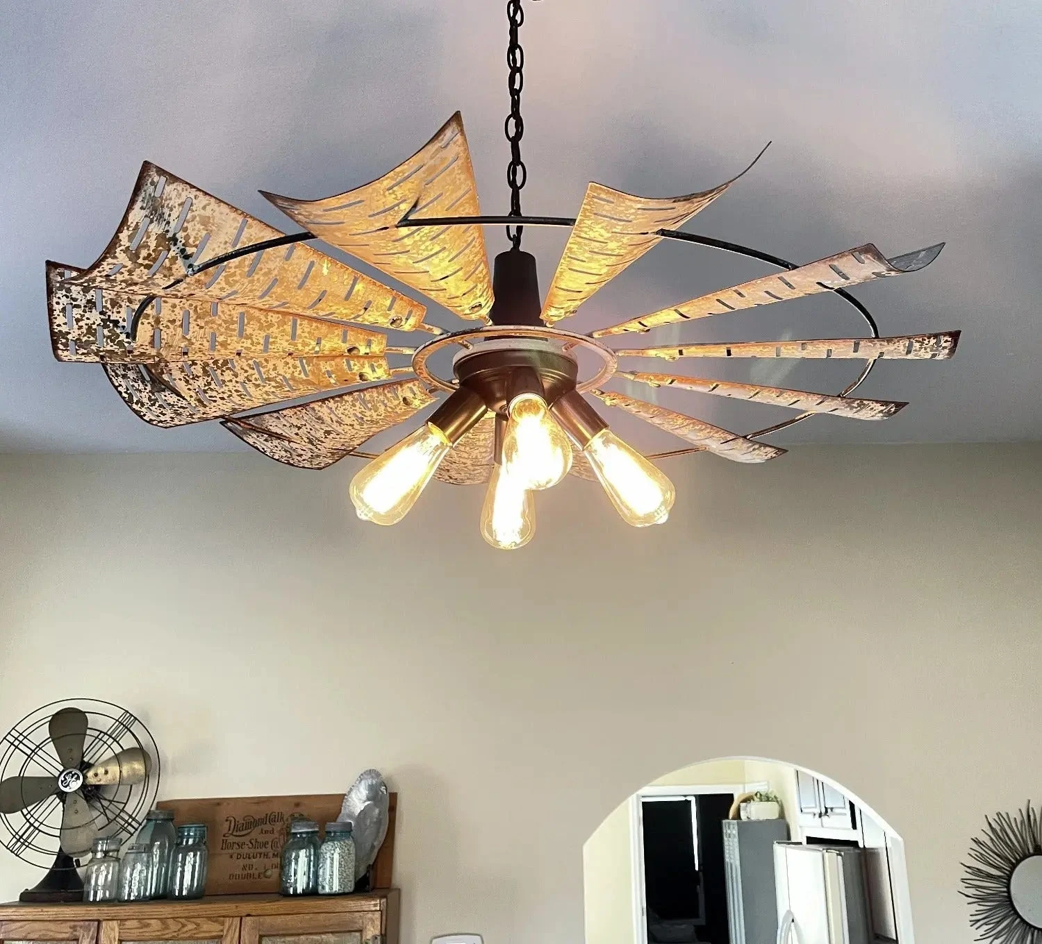 Our lead designer has created a farmhouse chandelier ceiling light featuring an original, heavy galvanized windmill that will be sure to add the perfect touch of modern farmhouse lighting goodness to your dining room or kitchen. (Light was Featured in Country Sampler magazine.)