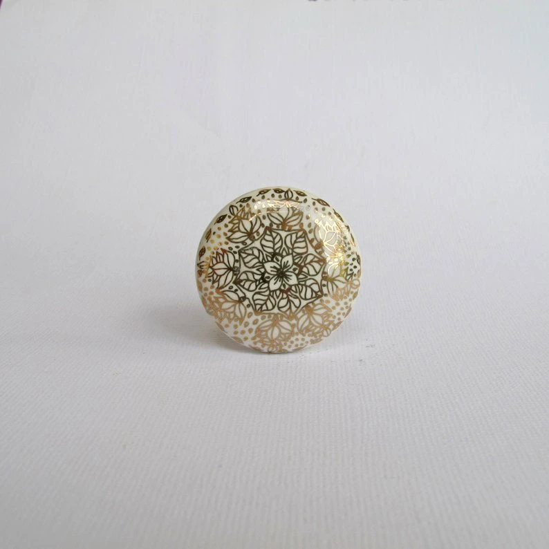 Intricate graphic gold floral design on white ceramic. Round Knob. Beautifully designed, lovely details. Gold paint on white ceramic knob.